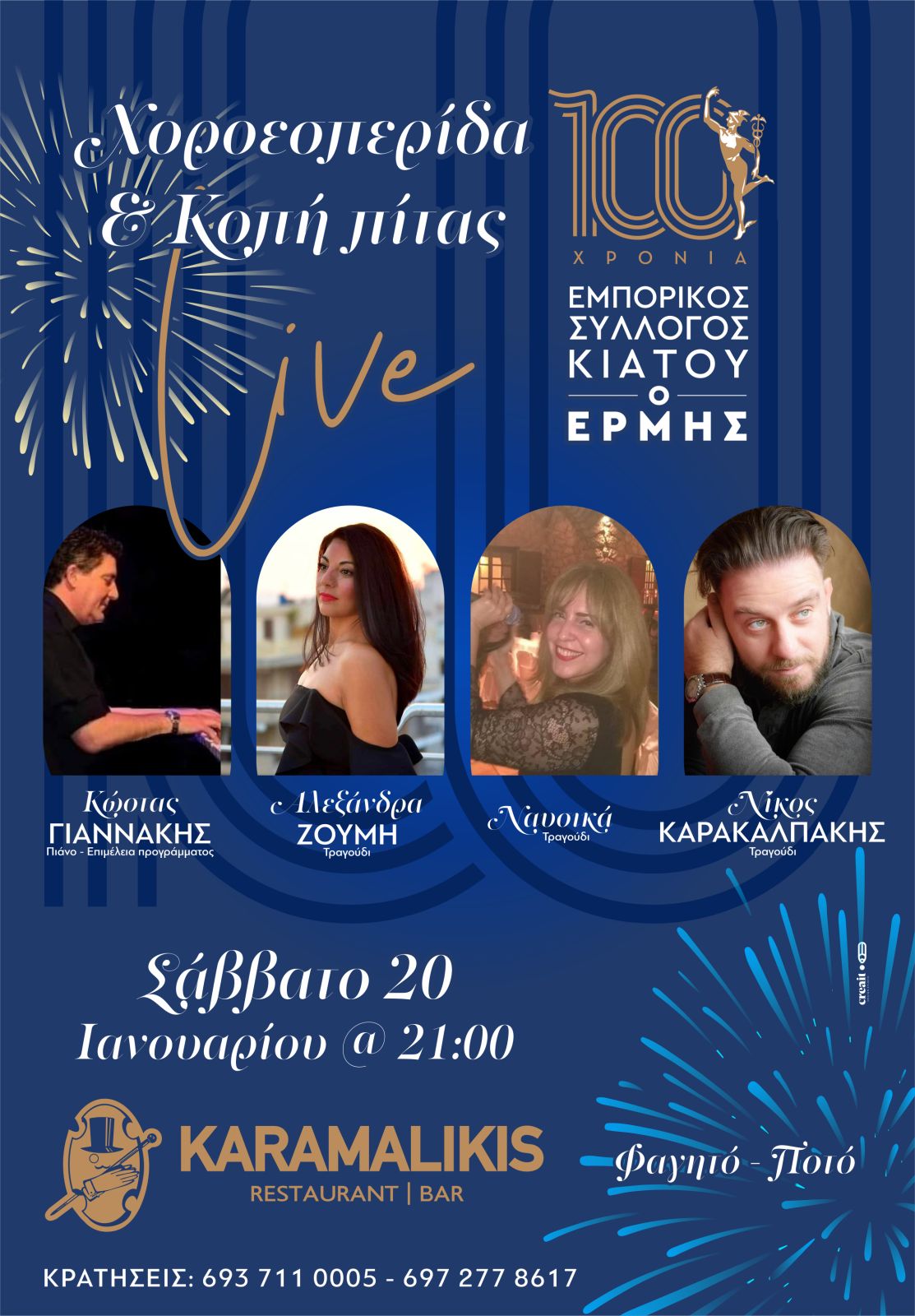 Ο Εμπορικός Σύλλογος Κιάτου “Ο Ερμής” κόβει την Πρωτοχρονιάτικη πίτα του και διοργανώνει για αυτό χοροεσπερίδα , αύριο Σάββατο 20 Ιανουαρίου στις 9 το βράδυ με φαγητό και ποτό. Στο restaurant – bar Karamalikis.