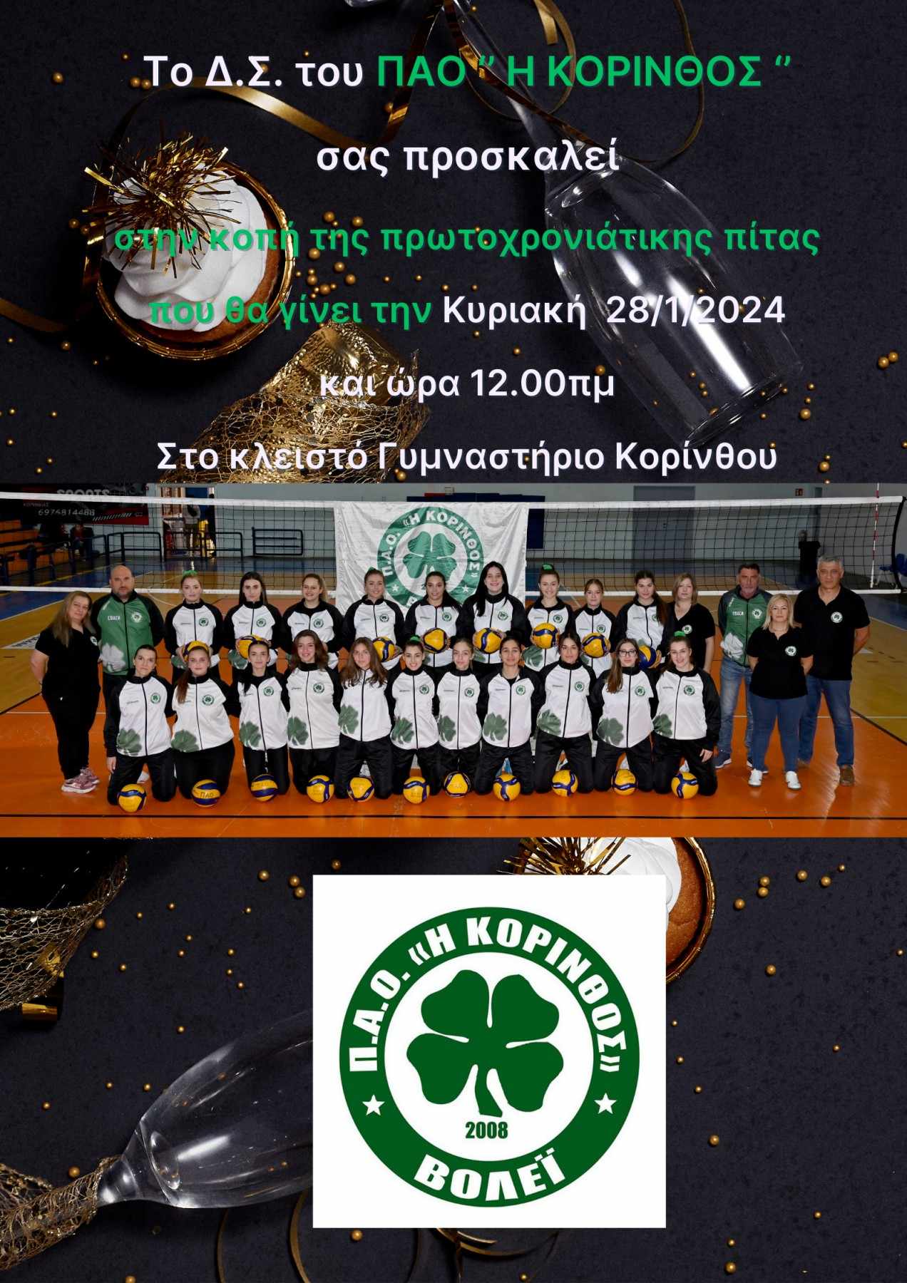 Η οικογένεια του ΠΑΟ Κορίνθου σας προσκαλεί στην κοπή της πρωτοχρονιάτικης πίτας που θα γίνει την Κυριακή 28/01/2024 στο κλειστό Γυμναστήριο Κορίνθου