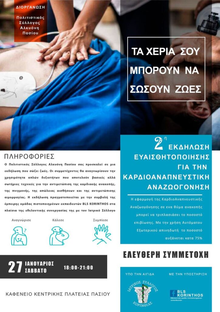 Έτσι ο Πολιτιστικός Σύλλογος “Αλκυόνη” Πασίου προσκαλεί σε μια εκδήλωση που σώζει ζωές. Οι συμμετέχοντες θα αναγνωρίσουν την χρησιμότητα απλών δεξιοτήτων που αποτελούν βασικές σωτήριες τεχνικές για την αντιμετώπιση της καρδιακής ανακοπής , της πνιγμονής, της απώλειας αισθήσεων και της αιμορραγίας.