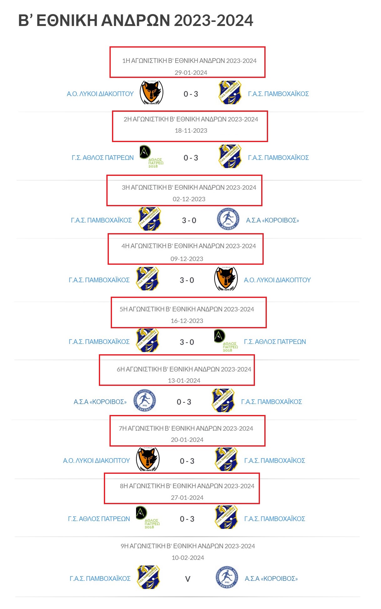 Οι άνδρες του Παμβοχαικού προχωρούν σταθερά την πρωτοπόρο πορεία τους μετά τη νίκη τους στον αγώνα του Σαββάτου με αντίπαλο τον “Άθλο” Πατρέων για το Πρωτάθλημα Β’ Εθνικής Ανδρών. Το επόμενο παιχνίδι εντός στις 10/2.