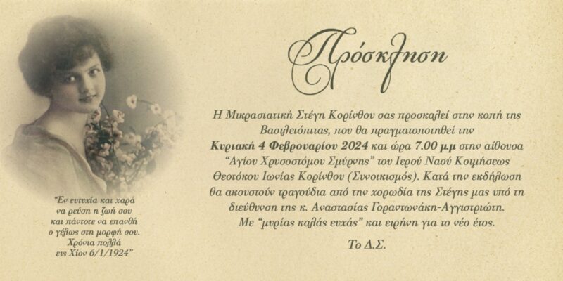 Η Μικρασιατική Στέγη Κορίνθου πραγματοποιεί την εκδήλωση κοπής της Πρωτοχρονιάτικης Πίτας την Κυριακή 4 Φεβρουαρίου και ώρα 7μμ στην “αίθουσα Χρυσοστόμου Σμύρνης” του Ι.Ν. Κοιμήσεως Θεοτόκου Ιωνίας Κορίνθου.