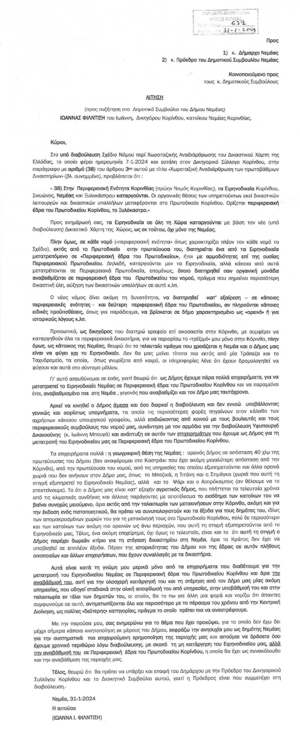 Αίτηση προς τον Δήμαρχο Νεμέας και τον Πρόεδρο του Δημοτικού Συμβουλίου, κατέθεσε την Τετάρτη 31/01/2024 η γνωστή Δικηγόρος Ιωάννα Φιλντίση (αρ. πρωτ. 632/31-1-2024), ενημερώνοντάς τους αφενός για το θέμα της κατάργησης των Ειρηνοδικείων όλης της Χώρας, με βάση το σχέδιο νόμου για τον νέο Δικαστικό Χάρτη, μεταξύ αυτών και του Ειρηνοδικείου Νεμέας και αφετέρου προτείνοντας να ασκήσει ο Δήμος πιέσεις στην κεντρική εξουσία και στον αρμόδιο για το θέμα υφυπουργό Δικαιοσύνης για τη μετατροπή του Ειρηνοδικείου σε Περιφερειακή έδρα του Πρωτοδικείου Κορίνθου, τονίζοντας ότι σε κάποιους νομούς δικαιολογείται για λόγους ιστορικούς και γεωγραφικούς και δεύτερη περιφερειακή έδρα του Πρωτοδικείου, γεγονός που αν το καταφέρει ο Δήμος μας, σημαίνει, όπως γράφει χαρακτηριστικά η κυρία Φιλντίση όχι μόνο δικαστηριακή αλλά και γενικότερη αναβάθμιση του Δήμου μας.