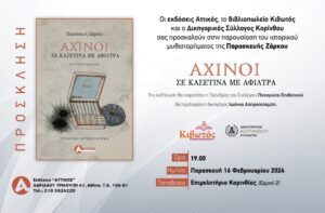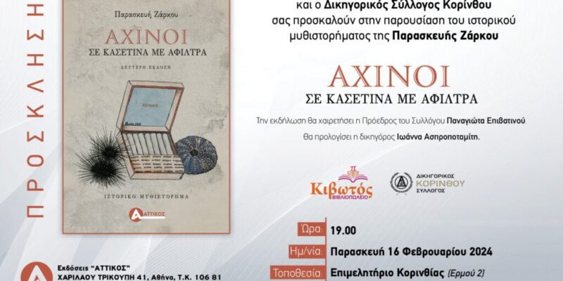 Οι εκδόσεις Αττικός, το βιβλιοπωλείο Κιβωτός και ο Δικηγορικός Σύλλογος Κορίνθου, σας προσκαλούν στην παρουσίαση του ιστορικού μυθιστορήματος της Παρασκευής Ζάρκου “Αχινοί σε κασετίνα με άφιλτρα”.