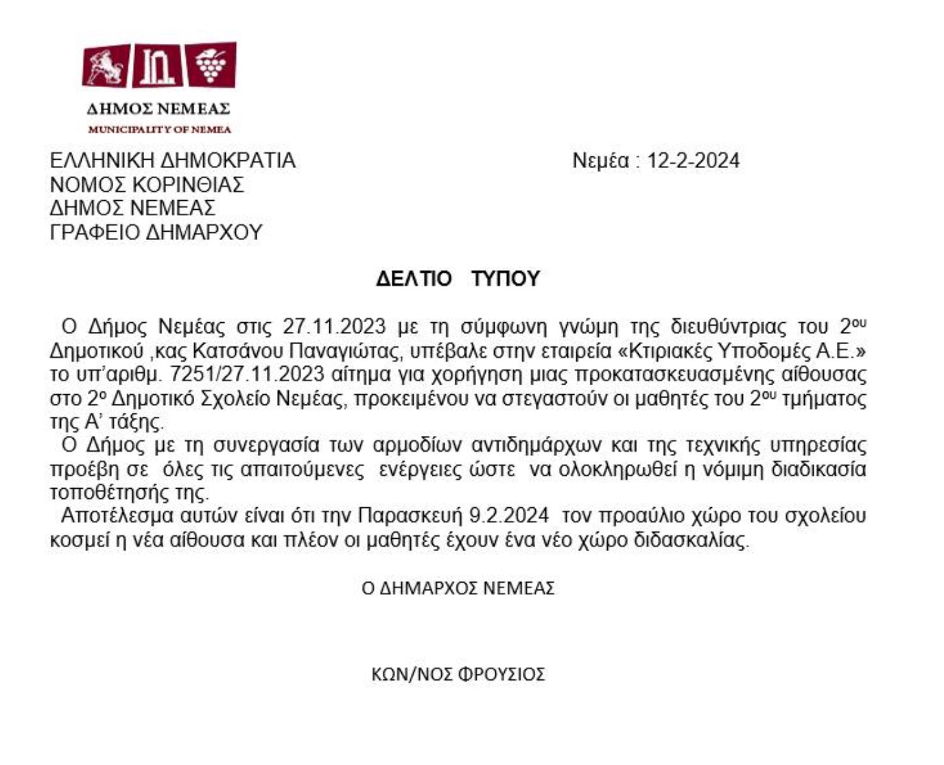 Μία νέα αίθουσα διδασκαλίας έχουν πια στη διάθεσή τους, από την Παρασκευή, οι μαθητές του 2ου Δημοτικού σχολείου Νεμέας κατόπιν ενεργειών της Δημοτικής Αρχής και του σχολείου. Διαβάστε τί αναφέρει το δελτίο Τύπου του Δήμου: