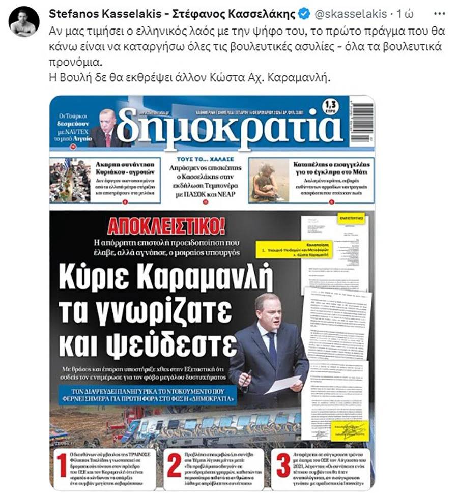 Με αφορμή τη σημερινή αποκάλυψη της εφημερίδας, ο Στέφανος Κασσελάκης προανήγγειλε κατάργηση της βουλευτικής ασυλίας σε περίπτωση που καταφέρει να εκλεγεί πρωθυπουργός.
