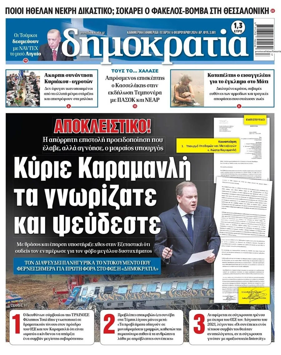 Το έγγραφο ανατρέπει τους ισχυρισμούς του Κώστα Καραμανλή και καλείται πλέον να δώσει εξηγήσεις στον ελληνικό λαό και πρωτίστως στις οικογένειες των θυμάτων της σιδηροδρομικής τραγωδίας.