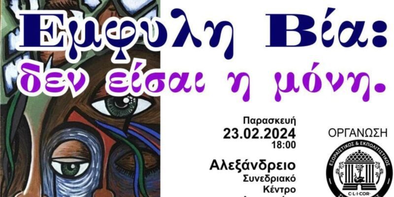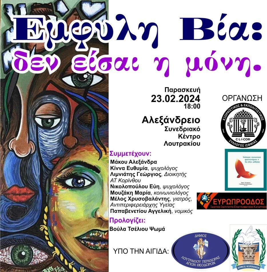Διαστάσεις των χαρακτηριστικών, της αιτιότητας, της έκτασης, της πρόληψης και της αντιμετώπισης της έμφυλης βίας θα αναδειχθούν στην ημερίδα με θέμα «Έμφυλη Βία: δεν είσαι η μόνη», που διοργανώνει ο “εξωραϊστικός και εκπολιτιστικός σύλλογος Ισθμίας”, σε συνεργασία με τον Σύλλογο Κοινωνικού Φροντιστηρίου & Δια βίου μάθησης και την Ευρωπρόοδο, την Παρασκευή 23/2/2024 και ώρα 18:00, στο Αλεξάνδρειο Συνεδριακό Κέντρο Λουτρακίου…