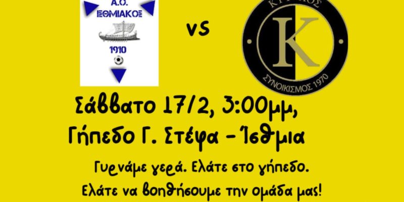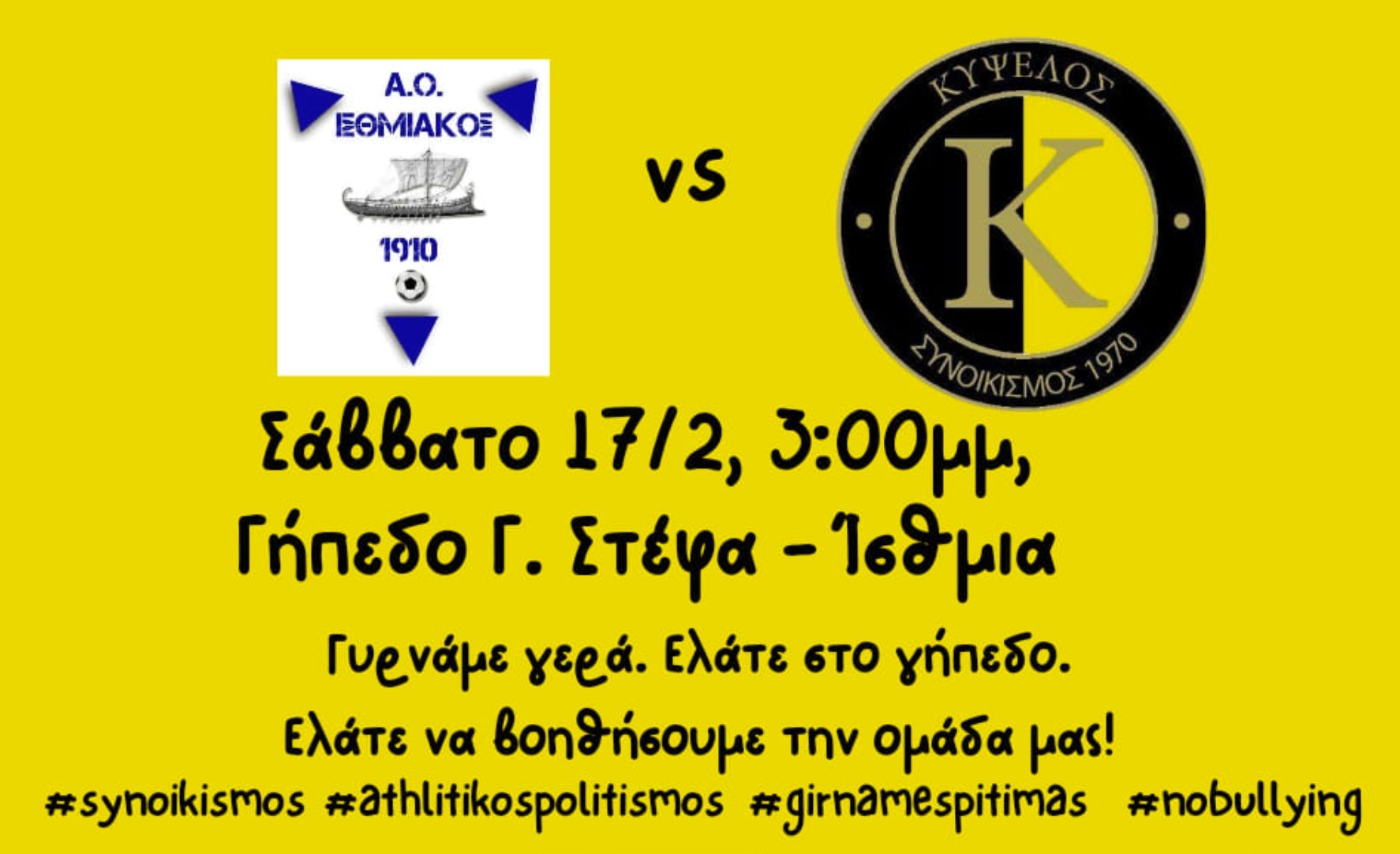 1_ΚΟΡΙΝΘΙΑ4_ΚΟΙΝΩΝΙΑΑΘΛΗΤΙΣΜΟ Σήμερα ΠΑΣ Κύψελος και Ισθμιακός στο γήπεδο Γ. Στέφα By SFEDONA 17/02/2024 ShareTweet 0 Σήμερα Σάββατο ο ΠΑΣ Κύψελος και ο Α.Ο. Ισθμιακός θα αγωνιστούν στο γήπεδο Γ. Στέφα, στην έδρα του δεύτερου. Το παιχνίδι θα ξεκινήσει στις 3:00 μ.μ