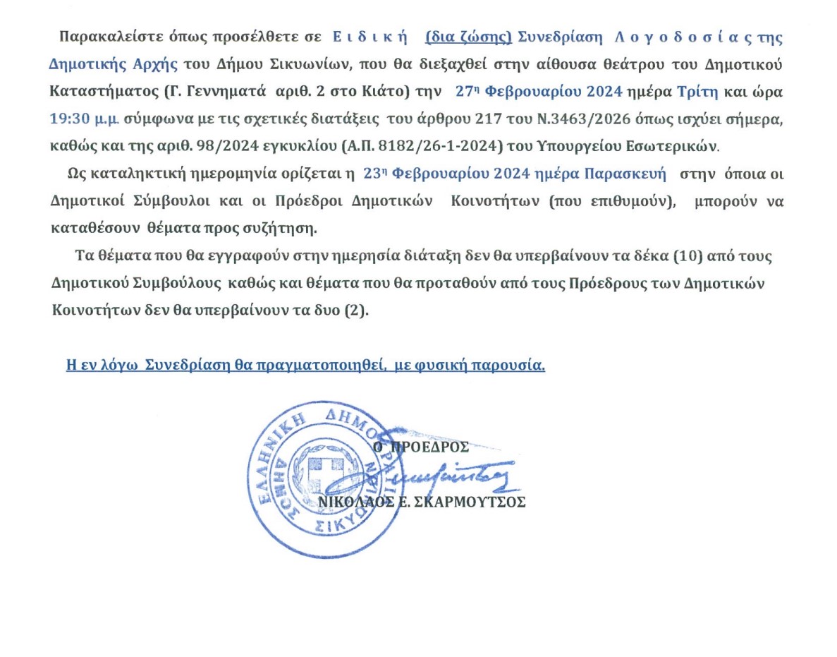 1_ΚΟΡΙΝΘΙΑ4_ΚΟΙΝΩΝΙΑΔΗΜΟΣ ΣΙΚΥΩΝΙΩΝ Πρόσκληση Ειδικής συνεδρίασης Λογοδοσίας της Δημοτικής Αρχής του Δήμου Σικυωνίων By SFEDONA 16/02/2024 ShareTweet 0