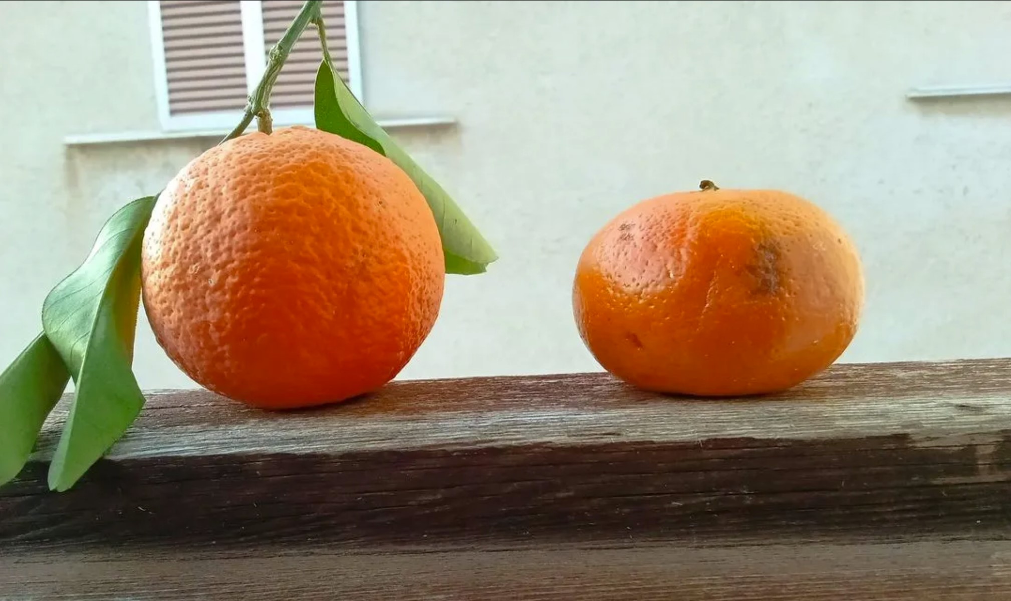 Αυτό αριστερά, το μεγαλύτερο με τα φύλλα, είναι από τα δικά μου περιβόλια στο Διμηνιό της Κορινθίας. Το άλλο, το μικρότερο με τα στίγματα, είναι από super market της Αθήνας. Και τα δύο είναι ποικιλία “Νόβα”, αλλά πέρα από το όνομα δεν μοιάζουν σε τίποτα άλλο.