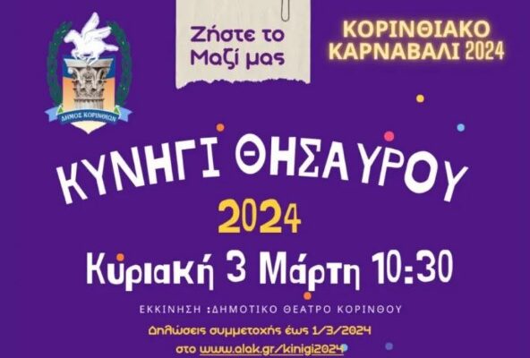 Ο Δήμος Κορινθίων διοργανώνει το Κυνήγι Θησαυρού 2024 στην Κόρινθο. Η εκδήλωση είναι ενταγμένη στις δράσεις για το Κορινθιακό Καρναβάλι 2024 και γίνεται με την στήριξη της Αγωνιστικής Λέσχης Αυτοκίνητου Κορινθίας. Το Κυνήγι Θησαυρού 2024 θα γίνει την Κυριακή 3 Μαρτίου σε κεντρικά σημεία του Δήμου Κορινθίων με εκκίνηση το Δημοτικό Θέατρο Κορίνθου (Δαμασκηνού & Κολοκοτρώνη).