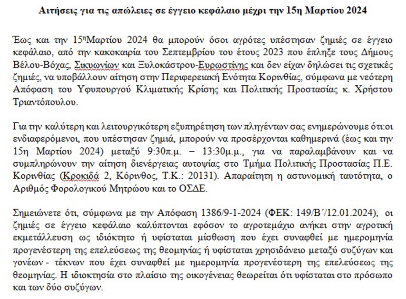 Μπορείτε να υποβάλετε αίτηση για αποζημίωση έως τις 15 Μαρτίου 2024 στην Περιφερειακή Ενότητα Κορινθίας.