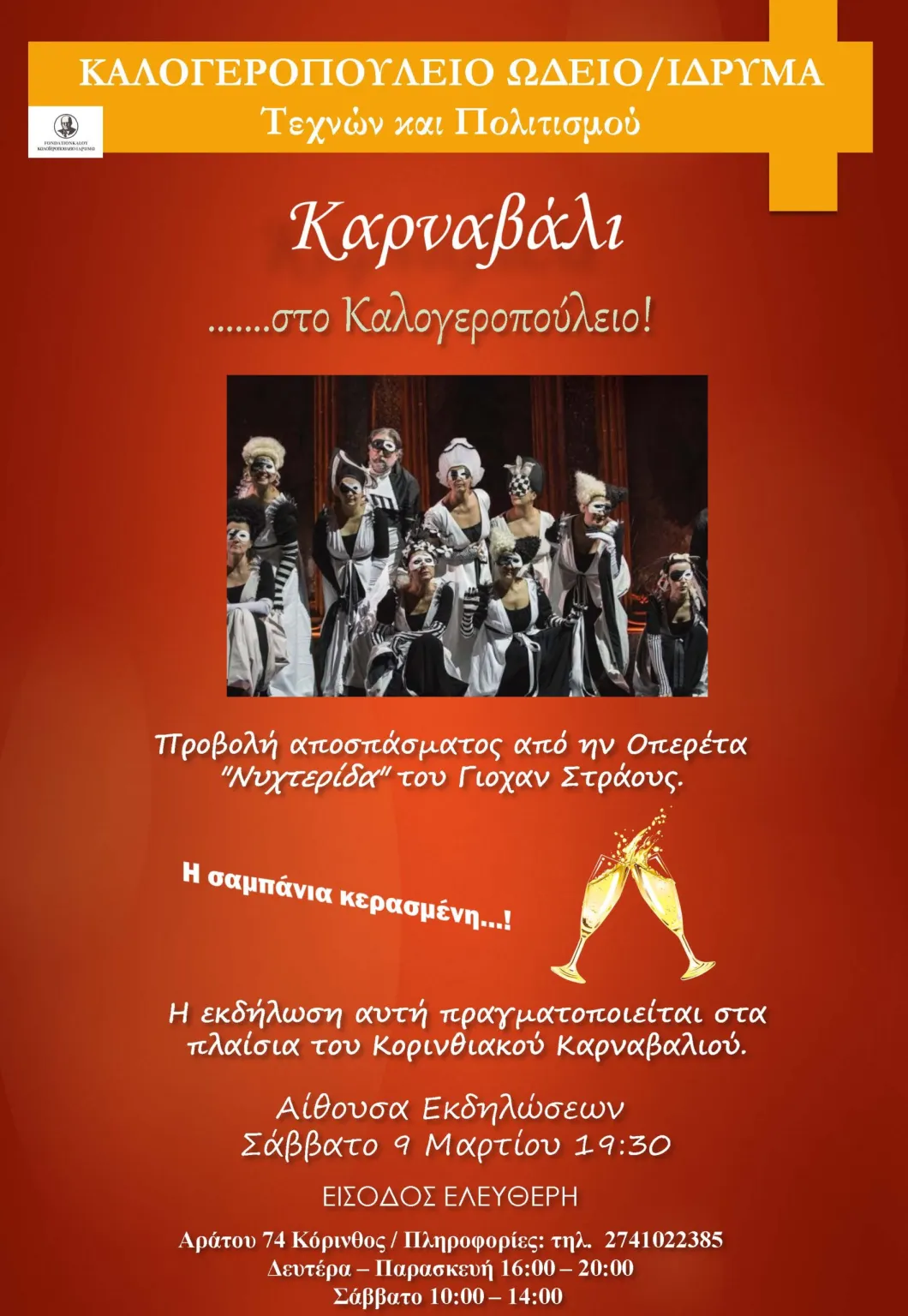 Έναν ξεχωριστό τρόπο διάλεξε το Καλογεροπούλειο Ίδρυμα για να συμμετάσχει στις καρναβαλικές εκδηλώσεις για το 2024 στην Κόρινθο. Ειδικότερα έχει προγραμματίσει να μεταδώσει αποσπάσματα από την θρυλική οπερέτα του Γιόχαν Στράους “Νυχτερίδα”, η οποία περιέχει έντονα καρναβαλικά στοιχεία, στην πρώτη πράξη.