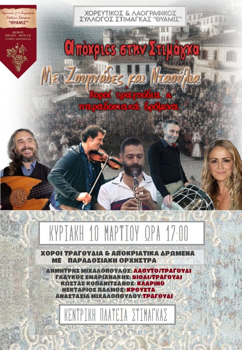 Ο Χορευτικός & Λαογραφικός Σύλλογος Στιμάγκας «Θύαμις», διοργανώνει στην κεντρική πλατεία του χωριού αποκριάτικο χορό την Κυριακή 10 Μαρτίου.