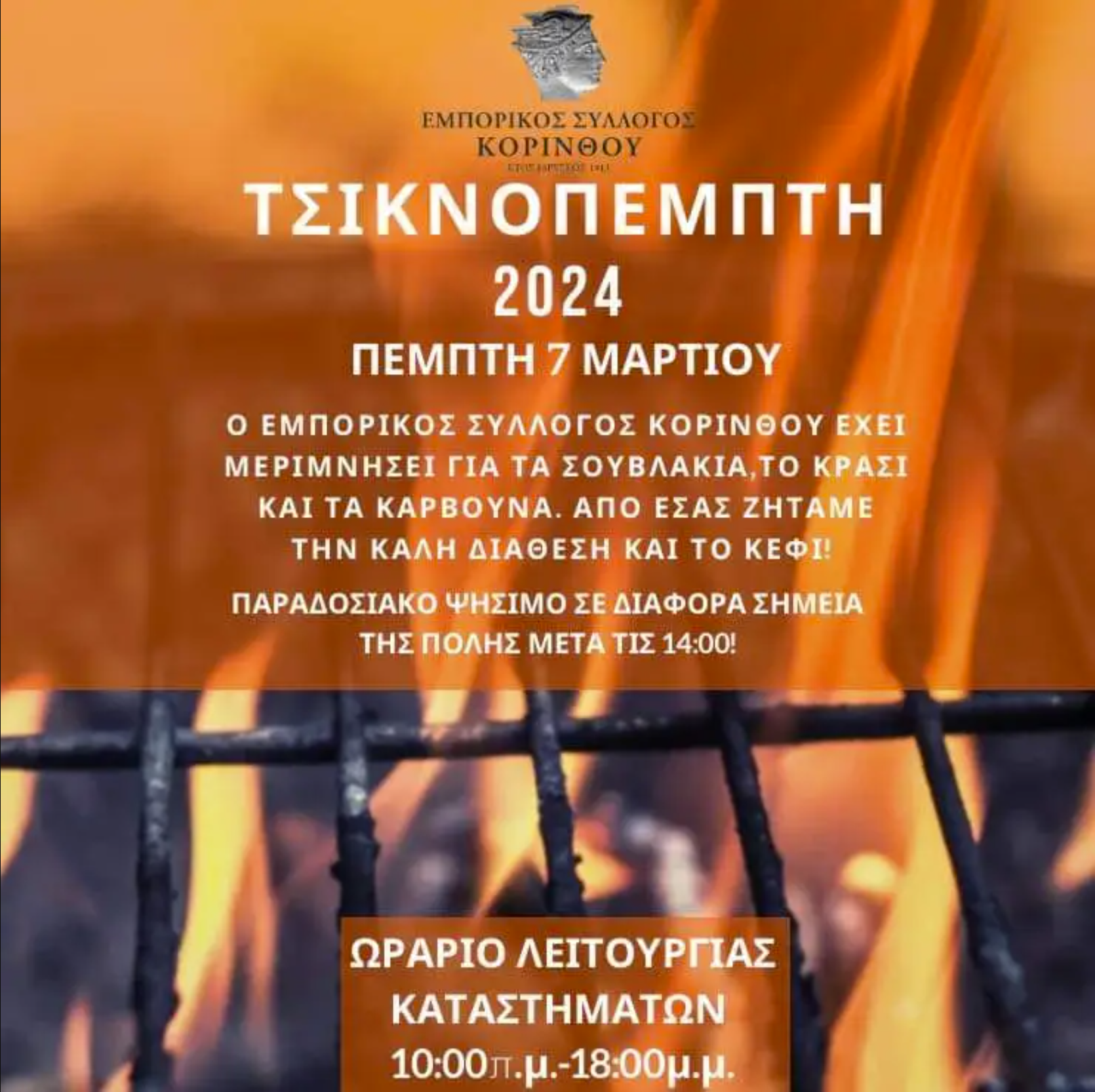 1_ΚΟΡΙΝΘΙΑ4_ΚΟΙΝΩΝΙΑΕΚΔΗΛΩΣΕΙΣ Εμπορικός Σύλλογος Κορίνθου: Κέφι κρασί και σουβλάκια την Τσικνοπέμπτη By SFEDONA 06/03/2024 ShareTweet 0 Ο Εμπορικός Σύλλογος Κορίνθου προσκαλεί όλο τον εμπορικό κόσμο να γιορτάσουμε μαζί την ημέρα της Τσικνοπέμπτης! Πέμπτη 7 Μαρτίου. Ωράριο λειτουργίας καταστημάτων:10:00π.μ.-18:00μ.μ.