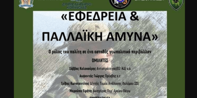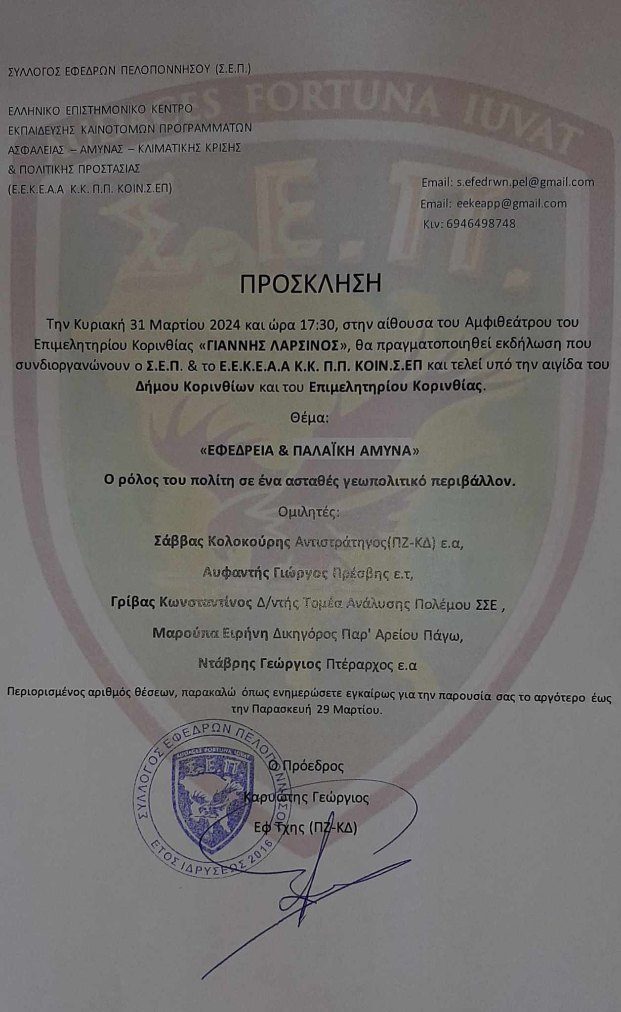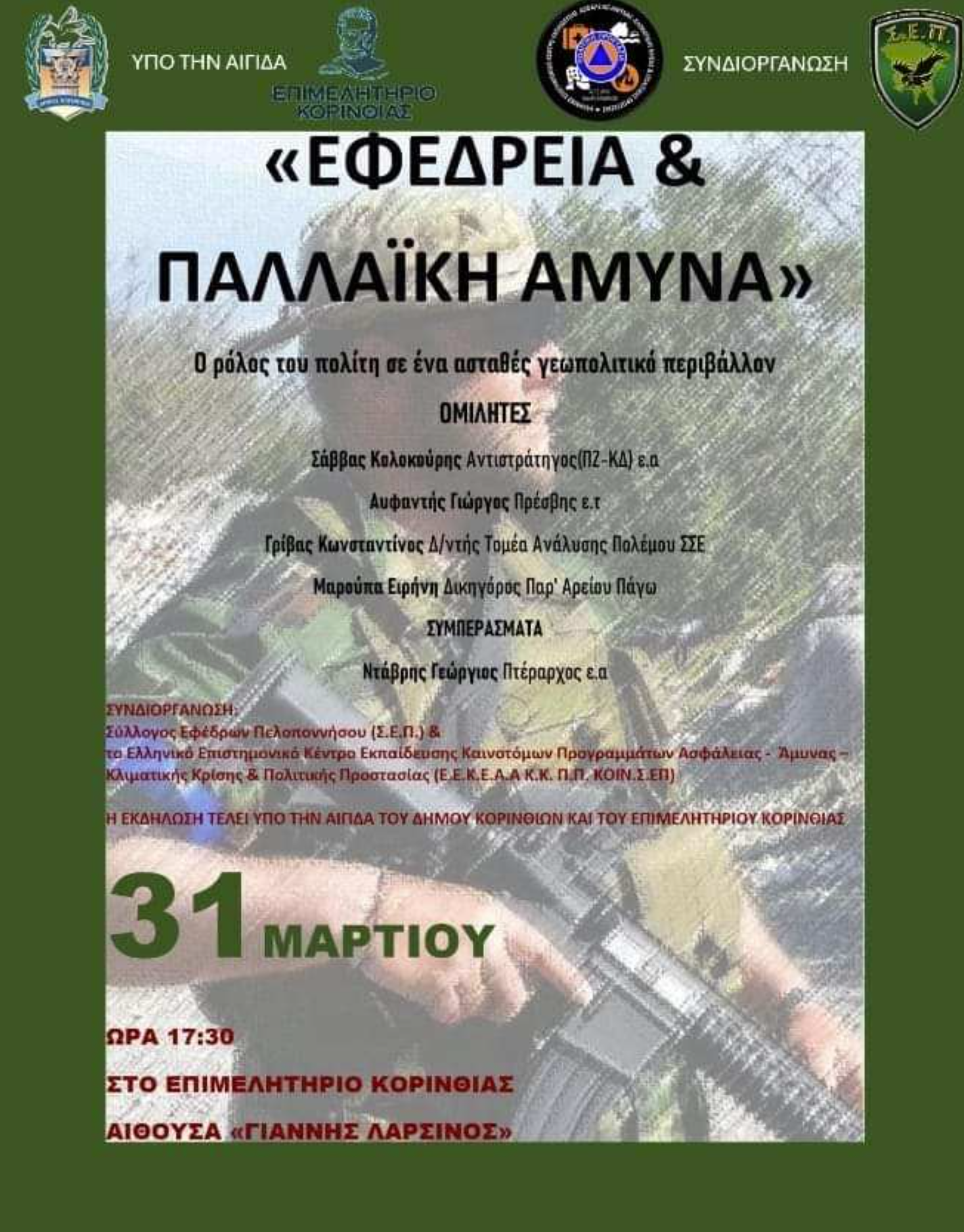Ο Σύλλογος Εφέδρων Πελοποννήσου(Σ.Ε.Π.) & το Ελληνικό Επιστημονικό Κέντρο Εκπαίδευσης Καινοτόμων Προγραμμάτων Ασφάλειας Άμυνας Κλιματικής Κρίσης και Πολιτικής Προστασίας (Ε.Ε.Κ.Ε.Α.Α Κ.Κ. Π.Π. ΚΟΙΝ.Σ.ΕΠ) και τελεί υπό την αιγίδα του Δήμου Κορινθίων και του Επιμελητηρίου Κορινθίας.