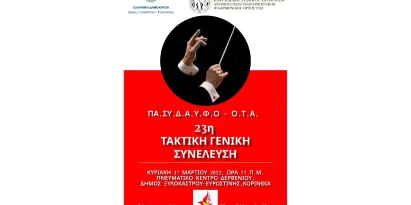Στο Πνευματικό Κέντρο του Ιερού Ναού Αγίου Ιωάννου Δερβενίου θα πραγματοποιηθεί την Κυριακή 31 Μαρτίου 2024 και ώρα 11 π.μ. η 23η Τακτική Γενική Συνέλευση του Πανελληνίου Συλλόγου Διευθυντών Αρχιμουσικών – Υπαρχιμουσικών Φιλαρμονικής Ορχήστρας (ΠΑ.ΣΥ.Δ.Α.Υ.Φ.Ο. -Ο.Τ.Α), υπό την αιγίδα του Δήμου Ξυλοκάστρου – Ευρωστίνης και της Δημοτικής Φιλαρμονικής Δερβενίου.