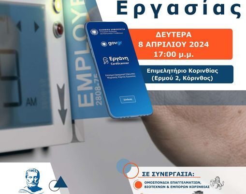 Το Επιμελητήριο Κορινθίας σε συνεργασία με την Επιθεώρηση Εργασίας σας προσκαλούν στο σεμινάριο με θέμα: «Ψηφιακή Κάρτα Εργασίας», τη Δευτέρα 8 Απριλίου και ώρα 17:00 μμ. στο αμφιθέατρο «Γιάννης Λαρσινός» του Επιμελητηρίου Κορινθίας, Ερμού 2 στην Κόρινθο.