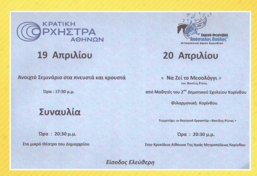 Η Κρατική Ορχήστρα Αθηνών, η Φιλαρμονική Ορχήστρα του Δήμου Κορινθίων και το 2ο Δημοτικό Σχολείο Κορίνθου συνεργάζονται για την πραγματοποίηση του Εαρινού Φεστιβάλ “Απόστολος Παύλος” που θα διεξαχθεί στην Κόρινθο στις 19 και 20 Απριλίου 2024.