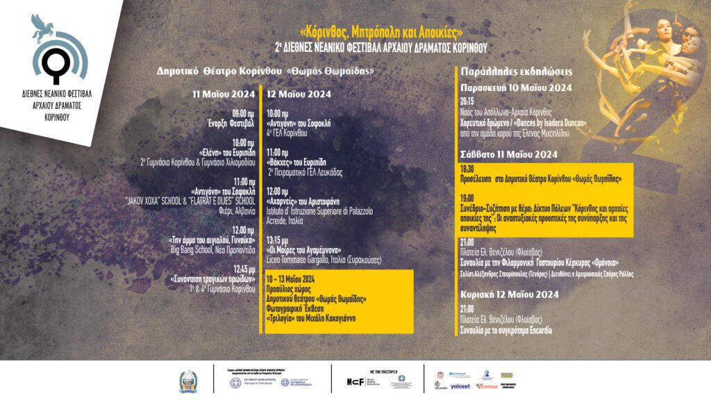 Παρουσιάστηκε την Μ. Δευτέρα 29 Απριλίου 2024 το πρόγραμμα και οι εκδηλώσεις που περιλαμβάνονται στο 2ο Διεθνές Νεανικό Φεστιβάλ Αρχαίου Δράματος Κορίνθου, που θα πραγματοποιηθεί στην Κόρινθο 10-13 Μαΐου 2024, μαζί με το συνέδριο «Δίκτυο πόλεων: Κόρινθος και αρχαίες αποικίες της: Οι αναπτυξιακές προοπτικές της συνύπαρξης και συναντίληψης».