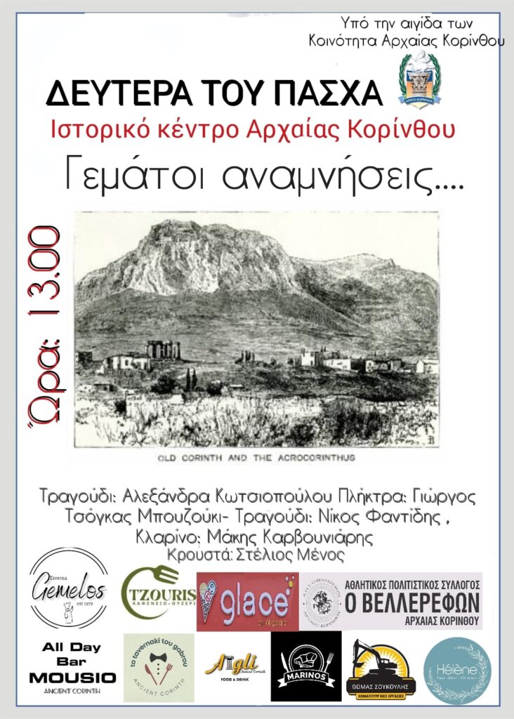 το Σύλλογο γονέων και κηδεμόνων Δημοτικού σχολείου Αρχαίας Κορίνθου και τον ΚΕΠΑΠ Δήμου Κορινθίων σας προσκαλούν στην οικογενειακή αναβίωση του Εθίμου της Δευτέρας του Πάσχα στο Αλσύλλιο του Ξενία Αρχαίας Κορίνθου, όπου θα διασκεδάσουμε με Παραδοσιακή και Λαϊκή ορχήστρα.