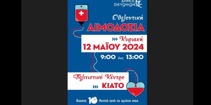 1_ΚΟΡΙΝΘΙΑ ΔΗΜΟΣ ΣΙΚΥΩΝΙΩΝ: Πρόσκληση σε Εθελοντική Αιμοδοσία By Sfedona edit 08/05/2024 ShareTweet 0 Σας προσκαλούμε στην Εθελοντική Αιμοδοσία που διοργανώνει η Τράπεζα Αίματος του Δήμου μας την Κυριακή 12 Μαΐου, στο Πολιτιστικό Κέντρο Κιάτου και ώρες 9:00-13:00. .