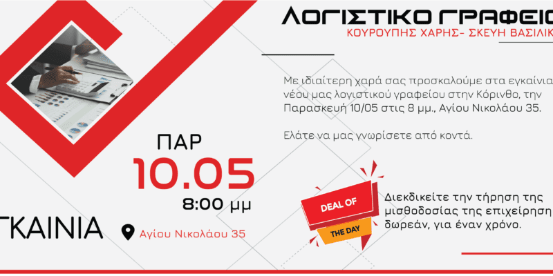 Με μεγάλη χαρά σας προσκαλούμε στα εγκαίνια του λογιστικού μας γραφείου επί της