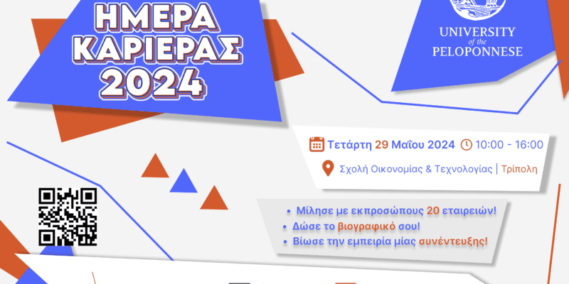 H Σχολή Οικονομίας και Τεχνολογίας του Πανεπιστημίου Πελοποννήσου, στο πλαίσιο της εξωστρέφειας και της επαφής των φοιτητών και των αποφοίτων του με την αγορά εργασίας, διοργανώνει φέτος για τρίτη συνεχόμενη χρονιά Ημέρα Καριέρας την Τετάρτη 29 Μαΐου 2024.