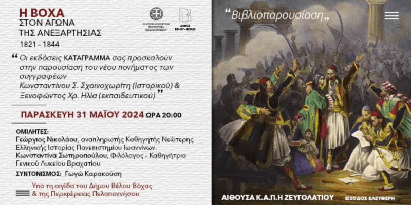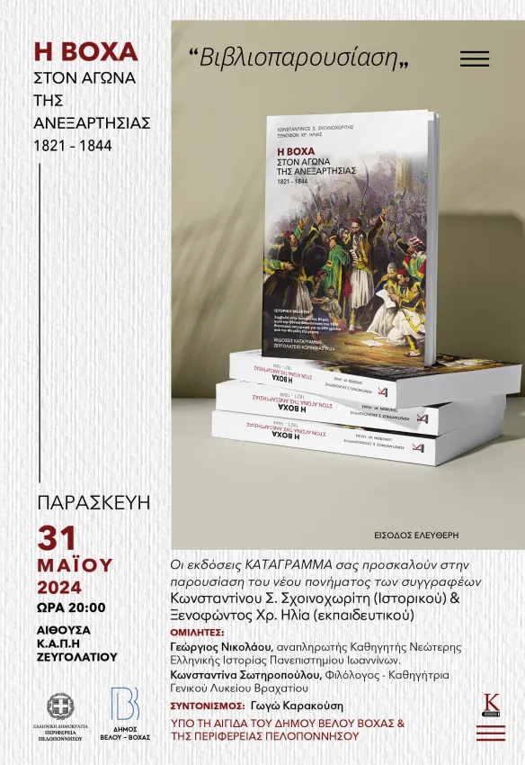 Παρουσίαση του βιβλίου που συνέγραψαν ο ιστορικός και συγγραφέας Κωνσταντίνος Σχοινοχωρίτης και ο εκπαιδευτικός Ξενοφών Ηλίας, με τίτλο “Η Βόχα στον Αγώνα της Ανεξαρτησίας 1821 – 1844”, θα πραγματοποιηθεί στο Ζευγολατιό, στην αίθουσα Κ.Α.Π.Η, την Παρασκευή 31 Μαΐου 2024 και ώρα 20.00.