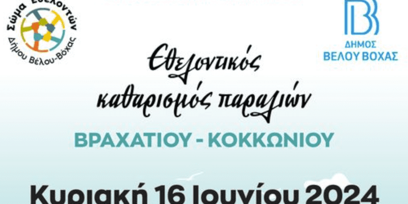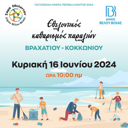Το Σώμα Εθελοντών του Δήμου Βέλου-Βόχας σε συνεργασία με τον Δήμο Βέλου-Βόχας διοργανώνουν την Κυριακή 16 Ιουνίου 2024, από τις 10:00 το πρωί έως τις 13:00 το μεσημέρι εθελοντικό καθαρισμό των παραλιών Βραχατίου και Κοκκωνίου.