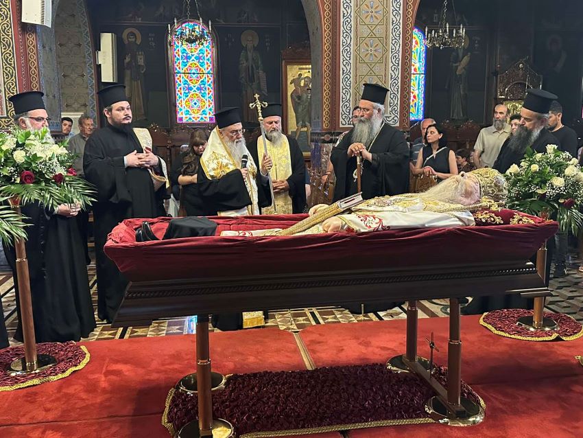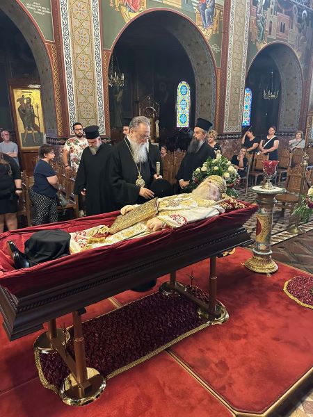 Ο σεπτός Ποιμενάρχης μας κ. Διονύσιος πληροφορηθείς την εκδημία του κυρού Αγαθονίκου, με τον οποίο τους συνέδεαν αδελφικοί εκκλησιαστικοί δεσμοί, βαθύτατα συγκινημένος, αφού ανεκοίνωσε το θλιβερό αυτό γεγονός, ομίλησε δι᾿ αυτόν στην 41η Γενική Ιερατική Σύναξη της Ι. Μητροπόλεως μας, που πραγματοποιήθηκε χθες, Δευτέρα 10 Ιουνίου 2024, στην «ΚΡΟΚΙΔΕΙΟ ΑΙΘΟΥΣΑ», για τον προγραμματισμό των «ΙΗ΄ ΚΟΡΙΝΘΟΥ ΠΑΥΛΕΙΩΝ 2024», τέλεσε, μετά των μετεχόντων Ιερέων στην Σύναξη, Νεκρώσιμο Τρισάγιο υπέρ αναπαύσεως της ψυχής αυτού, έδωσε οδηγία να χτυπούν την ημέρα της ταφής του νεκρώσιμα οι καμπάνες στην γενέτειρά του, το Βέλο, ενώ μη δυνάμενος λόγω ανειλημμένων υποχρεώσεων να παρευρεθεί στην Εξόδιο Ακολουθία, η οποία θα ψαλλεί σήμερα Τετάρτη, 11:00 π.μ., στον Ι. Ναό Αναλήψεως του Κυρίου Κατερίνης, μετέβη αυθημερόν μετά του Αιδεσ. π. Δημητρίου Στεργιόπουλου και του Αρχιδιακόνου π. Δαμασκηνού Γεννηματά στον ως Άνω Ι. Ναό στην Κατερίνη, όπου και ετέλεσε ενώπιον της σορού του μακαριστού Ιεράρχου Νεκρώσιμο Τρισάγιο και μετέφερε, κατά την επιθυμία του, χώμα εκ της ιδιαιτέρας αυτού πατρίδος δια να τοποθετηθεί, κατά την τάξη της Εκκλησίας μας, επί του ιερού του σκηνώματος. Είη η μνήμη αυτού αιωνία