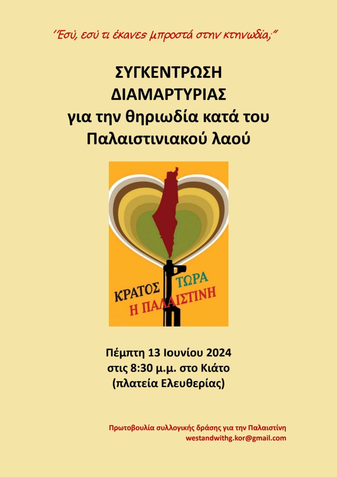 Μετά τη συγκέντρωση διαμαρτυρίας την περασμένη εβδομάδα στην Κόρινθο, πολίτες και συλλογικότητες της Κορινθίας δίνουμε νέο ραντεβού για να ενώσουμε τις φωνές μας ενάντια στη θηριωδία κατά του Παλαιστινιακού λαού, την Πέμπτη 13 Ιουνίου στις 8.30μ.μ. στο Κιάτο (στην πλατεία ΕΛΕΥΘΕΡΙΑΣ).
