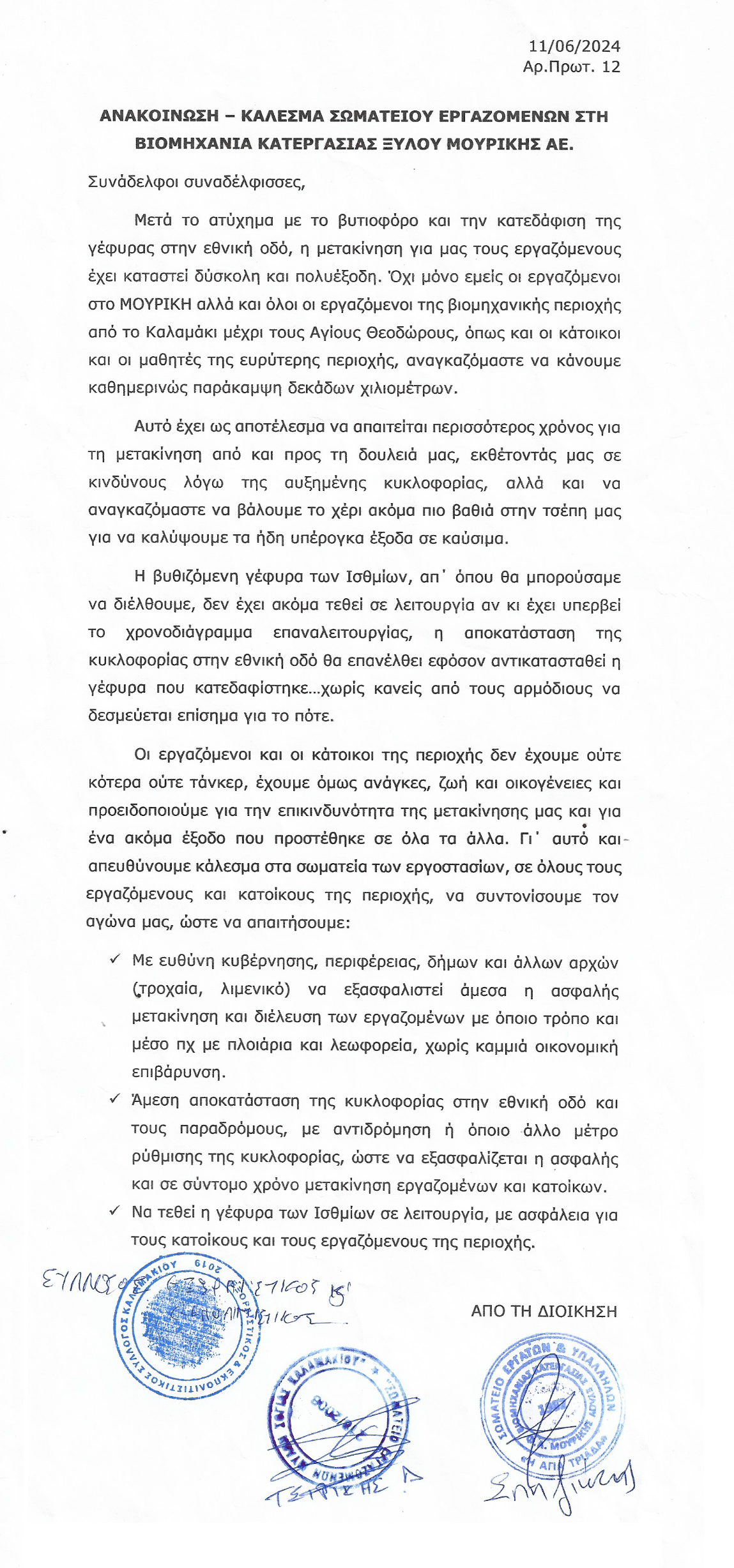 1_ΚΟΡΙΝΘΙΑ4_ΚΟΙΝΩΝΙΑ Κάλεσμα σε αγώνα από τα Σωματεία Εργαζομένων των εργοστασίων στο Καλαμάκι By SFEDONA 14/06/2024 ShareTweet 0 Η Κοινή ανακοίνωση των σωματείων για διέλευση από Ισθμια. Την ανακοίνωση συνυπογράφουν: Σωματείο εργαζομένων ΜΟΥΡΙΚΗΣ Σωματείο εργαζομένων ΜΥΛΟΙ ΣΟΓΙΑ ΠΟΛΙΤΙΣΤΙΚΟΣ & ΕΞΩΡΑΙΣΤΙΚΟΣ ΣΥΛΛΟΓΟΣ ΚΑΛΑΜΑΚΙΟΥ