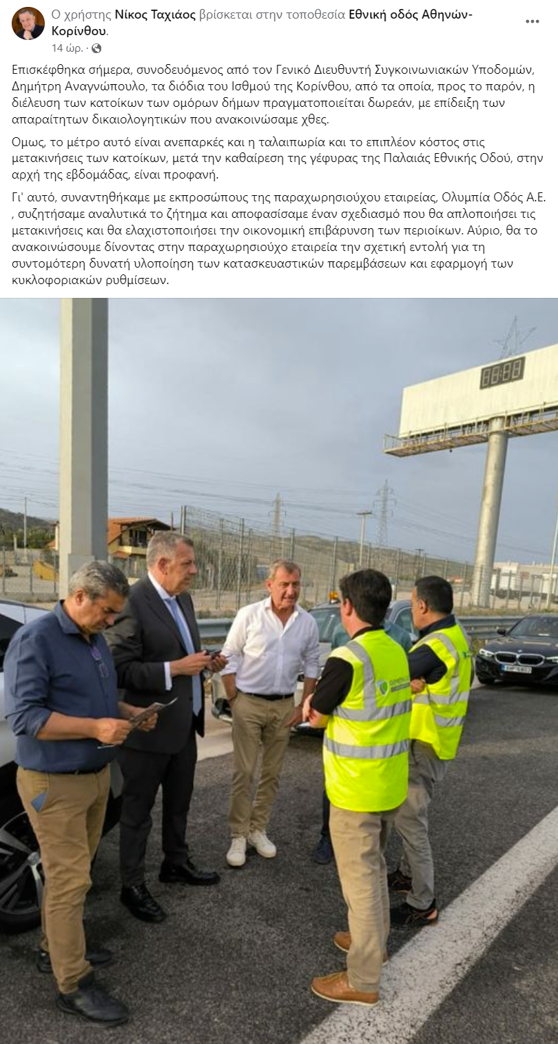 Όπως έγραψε σε ανάρτησή του στα social media, στα διόδια του Ισθμού η διέλευση των κατοίκων των όμορων δήμων πραγματοποιείται δωρεάν, με επίδειξη των απαραίτητων δικαιολογητικών που ανακοινώθηκαν χθες. Ωστόσο, το μέτρο αυτό είναι ανεπαρκές και η ταλαιπωρία καθώς και το επιπλέον κόστος στις μετακινήσεις των κατοίκων, μετά την καθαίρεση της γέφυρας της Παλαιάς Εθνικής Οδού στην αρχή της εβδομάδας, είναι προφανή.