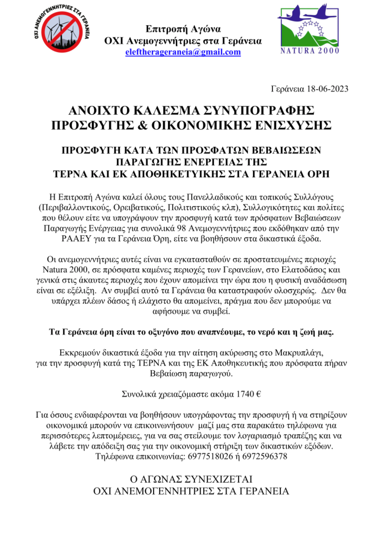 Η Επιτροπή Αγώνα καλεί όλους τους Πανελλαδικούς και τοπικούς Συλλόγους (Περιβαλλοντικούς, Ορειβατικούς, Πολιτιστικούς κλπ), Συλλογικότητες και πολίτες που θέλουν είτε να υπογράψουν την προσφυγή κατά των πρόσφατων Βεβαιώσεων Παραγωγής Ενέργειας για συνολικά 98 Ανεμογεννήτριες που εκδόθηκαν από την ΡΑΑΕΥ για τα Γεράνεια Όρη, είτε να βοηθήσούν στα δικαστικά έξοδα.