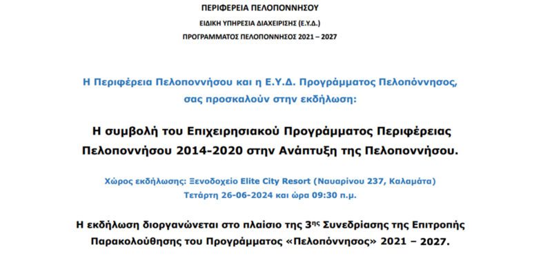 Η Περιφέρεια Πελοποννήσου και η Ειδική Υπηρεσία Διαχείρισης του Προγράμματος Πελοπόννησος 2021-2027 σας προσκαλούν στην εκδήλωση με θέμα: «Η συμβολή του Επιχειρησιακού Προγράμματος Περιφέρειας Πελοποννήσου 2014-2020 στην Ανάπτυξη της Πελοποννήσου» και στόχο την ενημέρωση φορέων και πολιτών για την υλοποίηση του Επιχειρησιακού Προγράμματος Περιφέρειας Πελοποννήσου 2014-2020, την συμβολή του στην ανάπτυξη της Περιφέρειας Πελοποννήσου, αλλά και τις προοπτικές αξιοποίησης των συγχρηματοδοτούμενων πόρων, όπως αυτές διαμορφώνονται στην Προγραμματική Περίοδο 2021-2027.