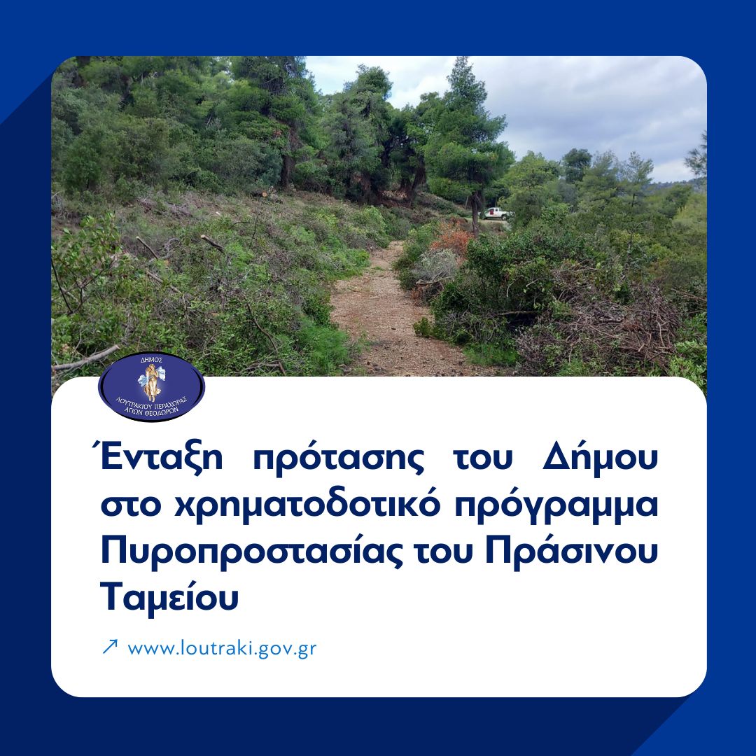 Ο Δήμο Λουτρακίου – Περαχώρας – Αγίων Θεοδώρων ανακοίνωσε την ένταξη στο χρηματοδοτικό πρόγραμμα Πυροπροστασίας του Πράσινου Ταμείου των αντιπυρικών ζωνών πλάτους 10 μέτρων, περιμετρικά οικισμών που βρίσκονται εντός ή πλησίον δασών και δασικών εκτάσεων υψηλής επικινδυνότητας για την εκδήλωση πυρκαγιών.