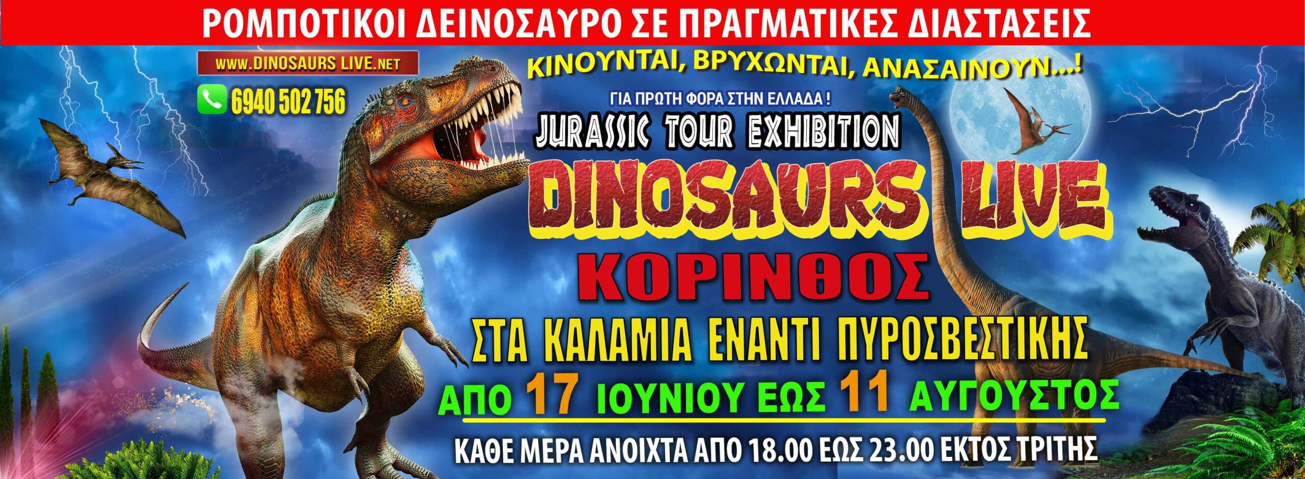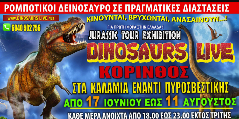 Οι ρομποτικοί “Δεινόσαυροι” που Κινούνται, Βρυχώνται και Ανασαίνουν έρχονται στην Κόρινθο για να μας πάνε πίσω στο παρελθόν στην εποχή των εντυπωσιακών αυτών ζώων.