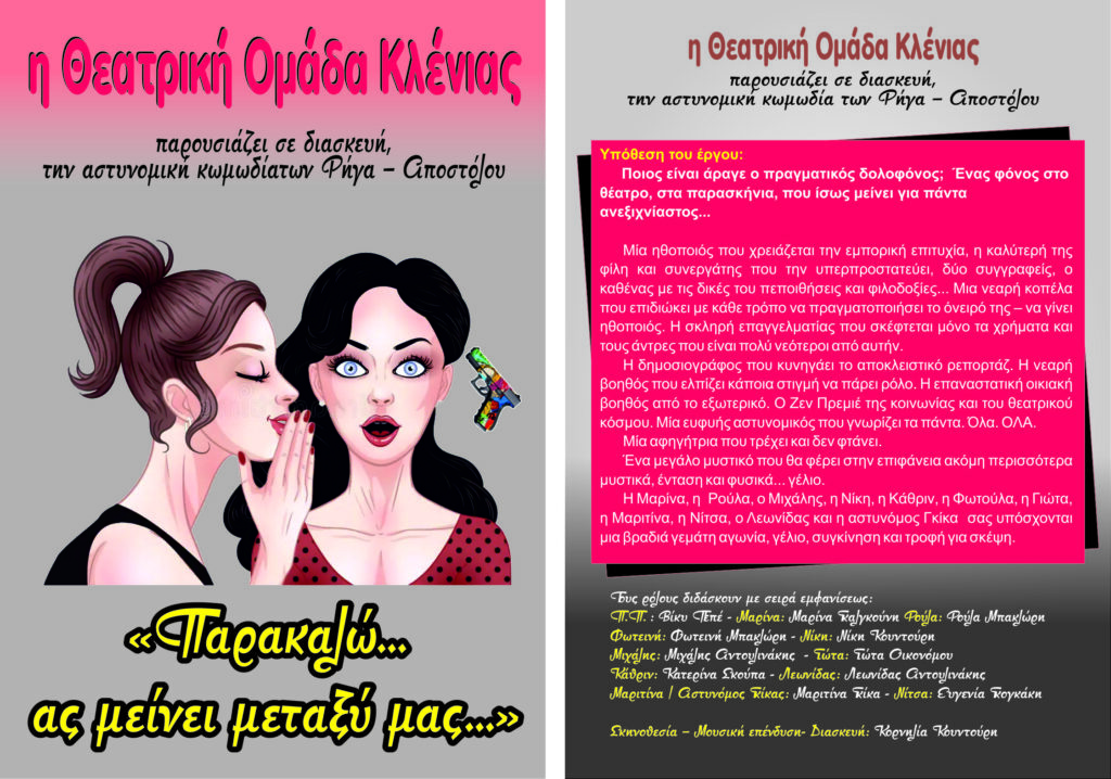 Η Θεατρική Ομάδα Κλένιας παρουσιάζει την αστυνομική κωμωδία των Ρήγα – Αποστόλου, “Παρακαλώ, ας μείνει μεταξύ μας…”.