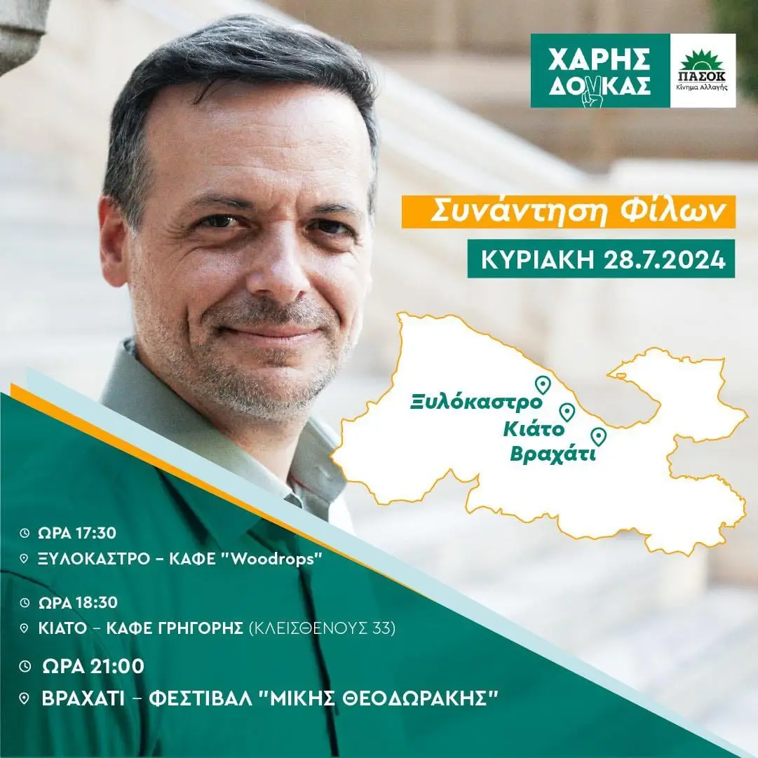 Την πρώτη επίσκεψη στην Κορινθία θα πραγματοποιήσει ο υποψήφιος πρόεδρος του ΠΑΣΟΚ, Χάρης Δούκας. Ο δήμαρχος Αθηναίων θα έχει τρεις συναντήσεις φίλων την ερχόμενη Κυριακή 28 Ιουλίου στη δυτική Κορινθία και συγκεκριμένα: