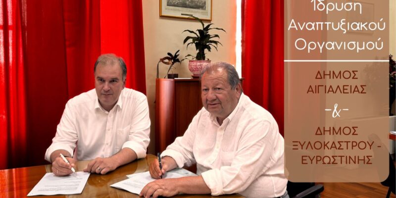 Την Τετάρτη 24 Ιουλίου έλαβε χώρα η υπογραφή του καταστατικού ίδρυσης Αναπτυξιακού Οργανισμού των Δήμων Αιγιαλείας και Ξυλοκάστρου-Ευρωστίνης. Οι Δήμαρχοι κ. Δημήτρης Καλογερόπουλος και Βλάσης Τσιώτος υπέγραψαν με ικανοποίηση το καταστατικό ίδρυσης του Αναπτυξιακού Οργανισμού «ΚΟΡΙΝΘΙΑΚΟΣ Α.Ε. – Α.Ο.Τ.Α.».