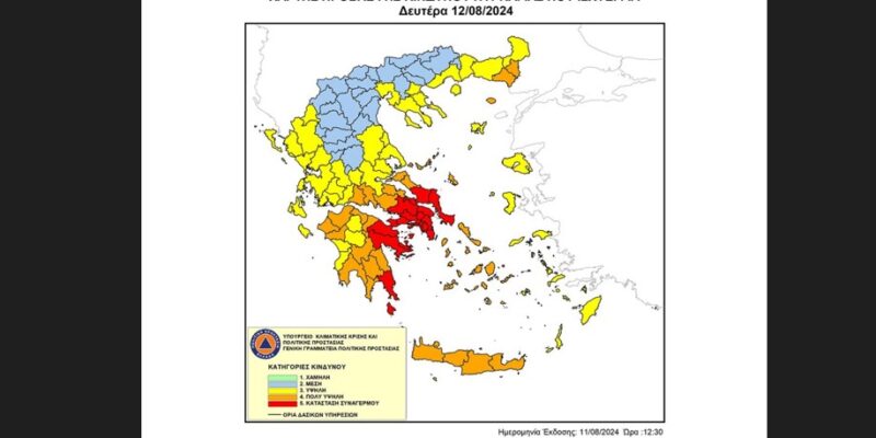 Σύμφωνα με το Χάρτη Πρόβλεψης Κινδύνου Πυρκαγιάς, τον οποίο εκδίδει η Γενική Γραμματεία Πολιτικής Προστασίας του Υπουργείου Κλιματικής Κρίσης & Πολιτικής Προστασίας για την Δευτέρα 12 Αυγούστου, σε κατάσταση συναγερμού βρίσκονται οι Νομοί Αργολίδας, Κορινθίας και Λακωνίας, ενώ προβλέπεται πολύ υψηλός κίνδυνος δασικής πυρκαγιάς (κατηγορία κινδύνου 4) στους Νομούς Αρκαδίας και Μεσσηνίας.