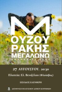 - Τρίτη 27/8, συναυλία με τον Πάνο Μουζουράκη: Κάτω από τα φώτα της πλατείας του Φλοίσβου θα χορέψουμε, θα τραγουδήσουμε και θα απολαύσουμε τον πληθωρικό καλλιτέχνη, σε μία ακόμα μοναδική συναυλία του φετινού καλοκαιριού.