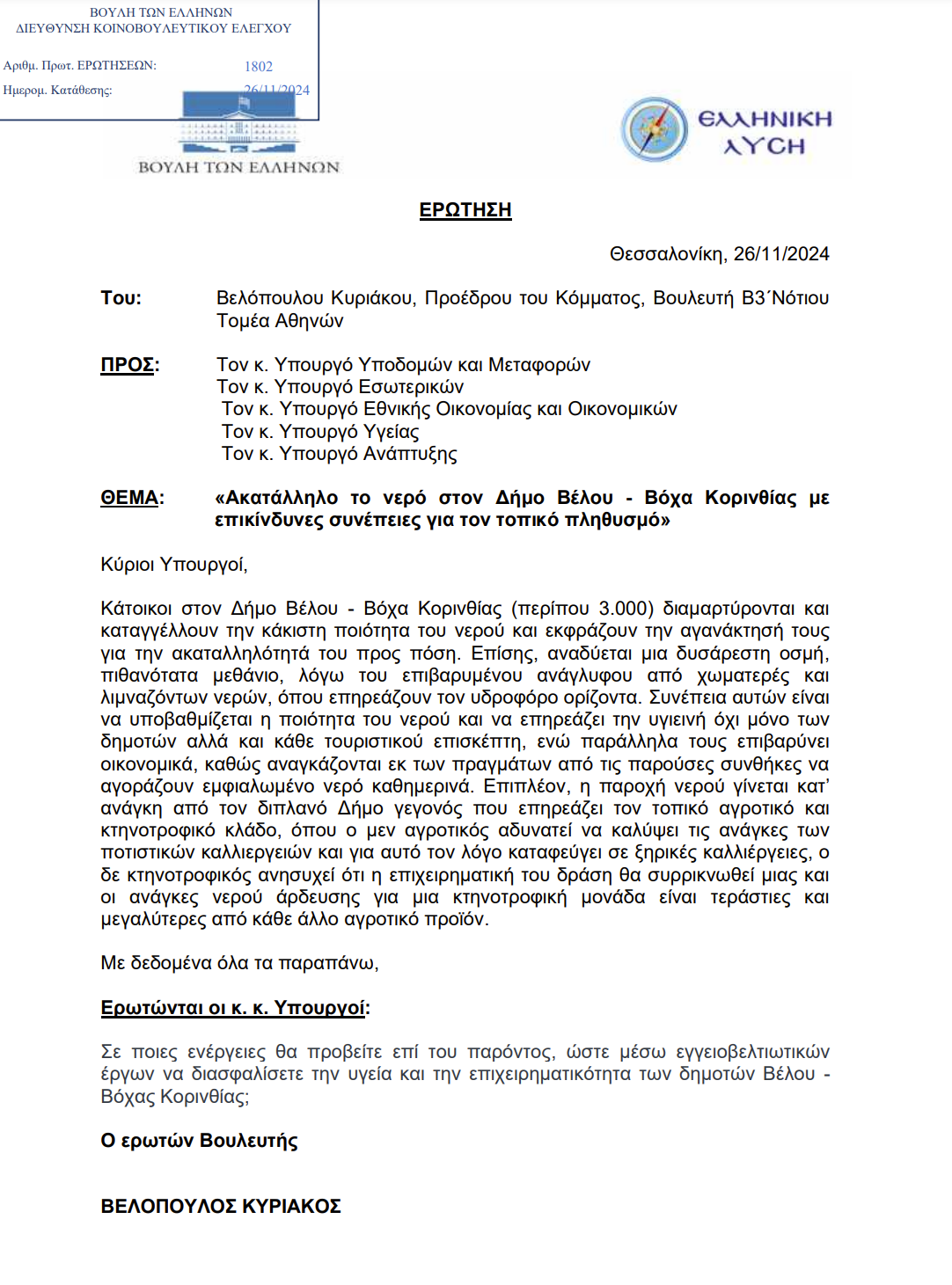 Με επίκαιρη ερώτηση που κατέθεσε στην Ελληνική Βουλή, ο πρόεδρος της Ελληνικής Λύσης Κυριάκος Βελόπουλος ζητάει εξηγήσεις για τo ακατάλληλο το νερό στον Δήμο Βέλου – Βόχας, που έχει επικίνδυνες συνέπειες για τον τοπικό πληθυσμό.