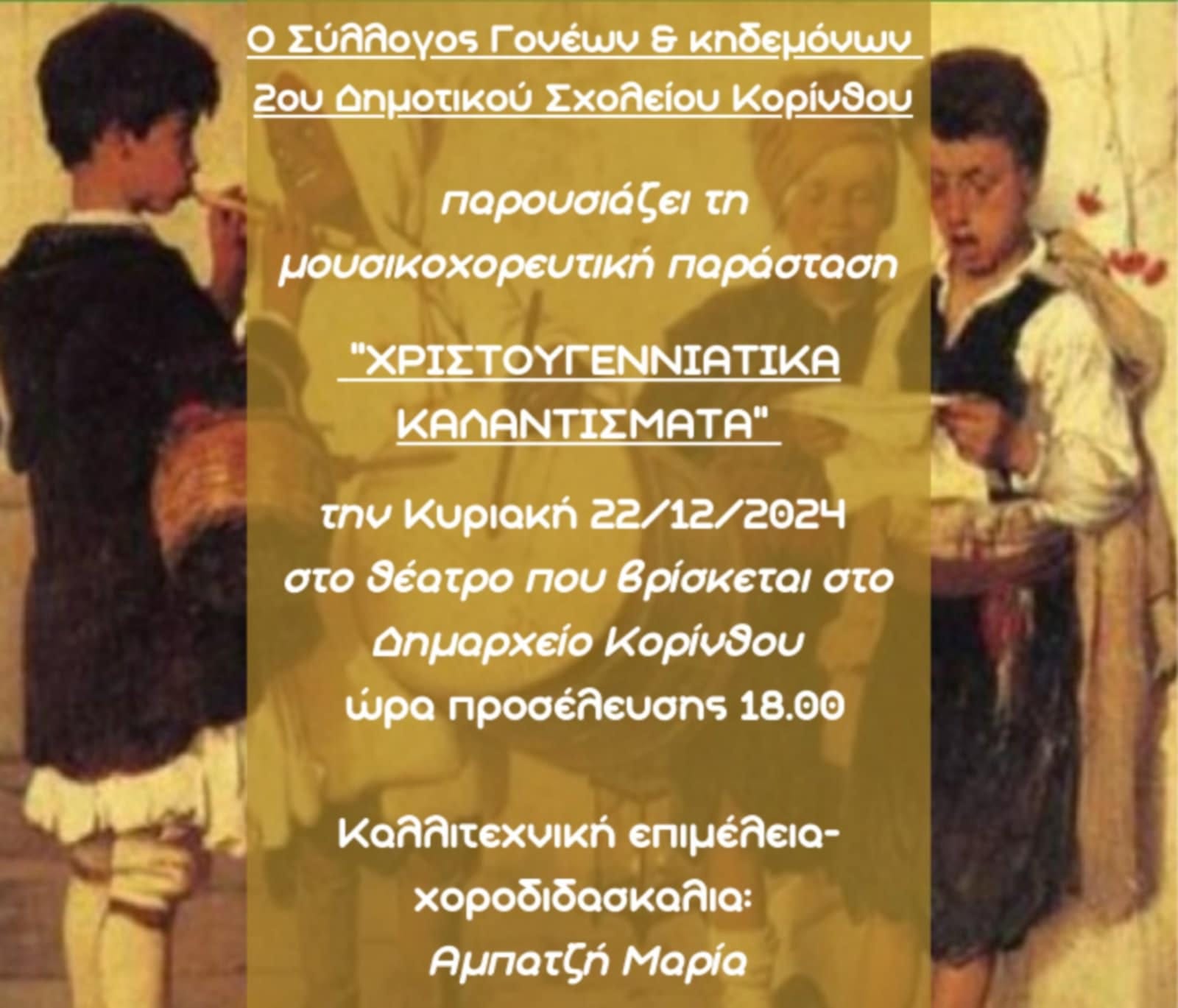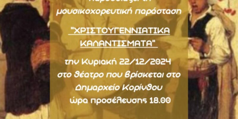 Την Κυριακή 22 Δεκεμβρίου ο Σύλλογος Γονέων 2ου Δημοτικού Σχολείου Κορίνθου παρουσιάζει τη μουσικό-χορευτική παράσταση “Χριστουγεννιάτικα Καλαντίσματα”, στο θεατράκι του δημαρχείου Κορίνθου ώρα 6:00 το απόγευμα.