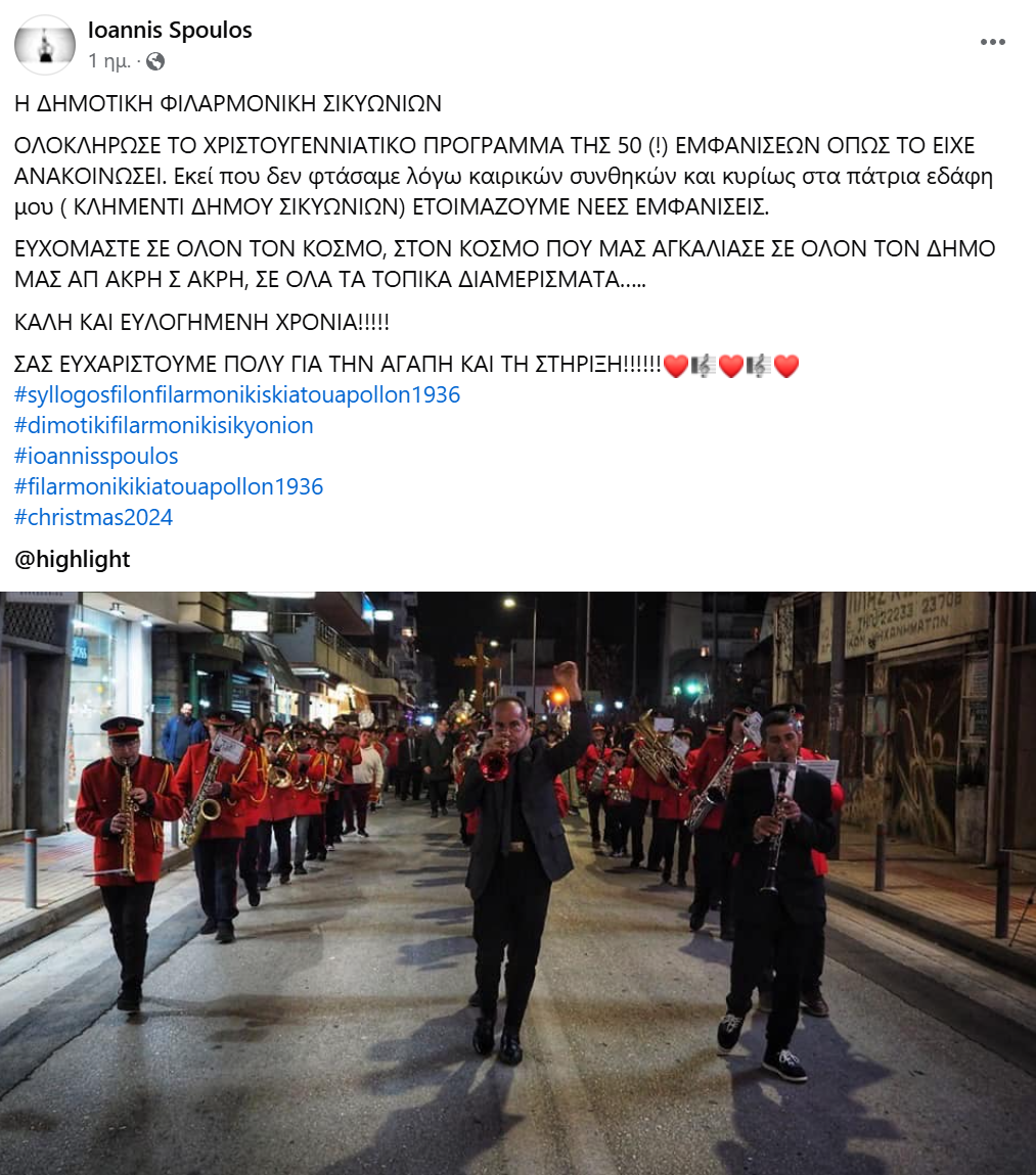 Με μια συγκινητική ανακοίνωση στο Facebook, ο αρχιμουσικός της Δημοτικής Φιλαρμονικής Σικυωνίων, Ιωάννης Σπούλος, ενημέρωσε το κοινό για την ολοκλήρωση του χριστουγεννιάτικου προγράμματος της φιλαρμονικής. Το πρόγραμμα περιελάμβανε 50 εμφανίσεις, που σκόρπισαν τη μαγεία των Χριστουγέννων σε όλο τον Δήμο Σικυωνίων.