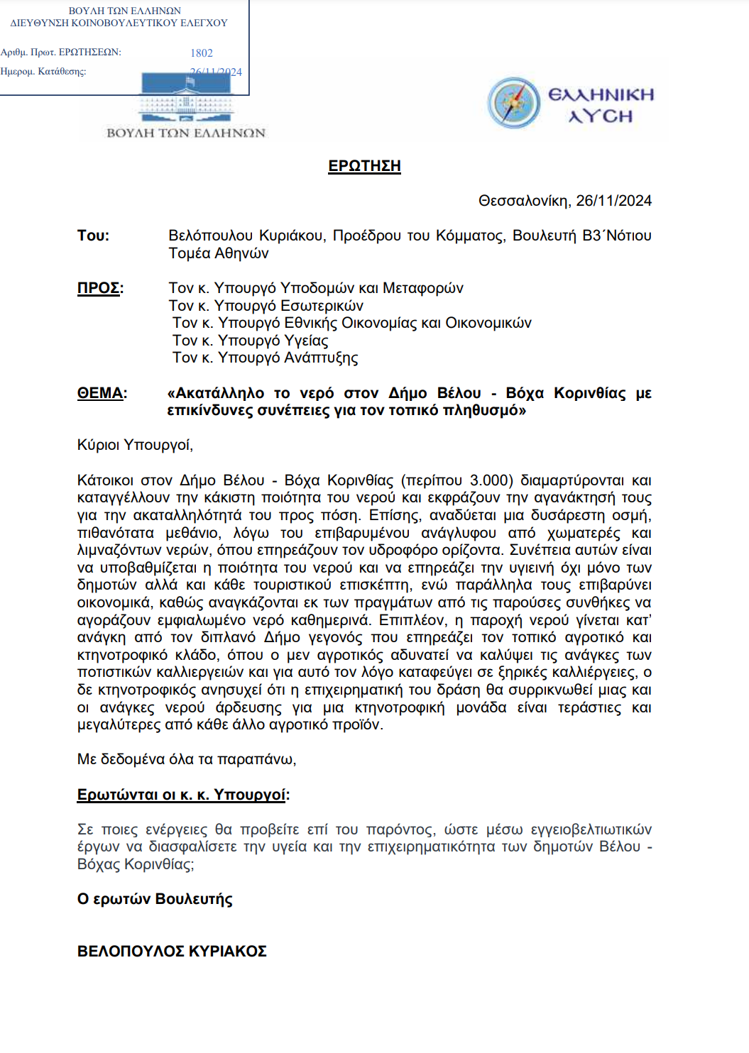 Ο Βουλευτής Κυριάκος Βελόπουλος κατέθεσε σχετική ερώτηση στη Βουλή, αναδεικνύοντας τις σοβαρές συνέπειες του προβλήματος στην υγεία των πολιτών, τον τουρισμό και τις οικονομικές δραστηριότητες της περιοχής. Όπως επισημαίνει, οι δημότες αναγκάζονται να καταφεύγουν σε εμφιαλωμένο νερό για την κάλυψη των βασικών αναγκών τους, ενώ η παροχή νερού εξαρτάται από τον γειτονικό Δήμο.