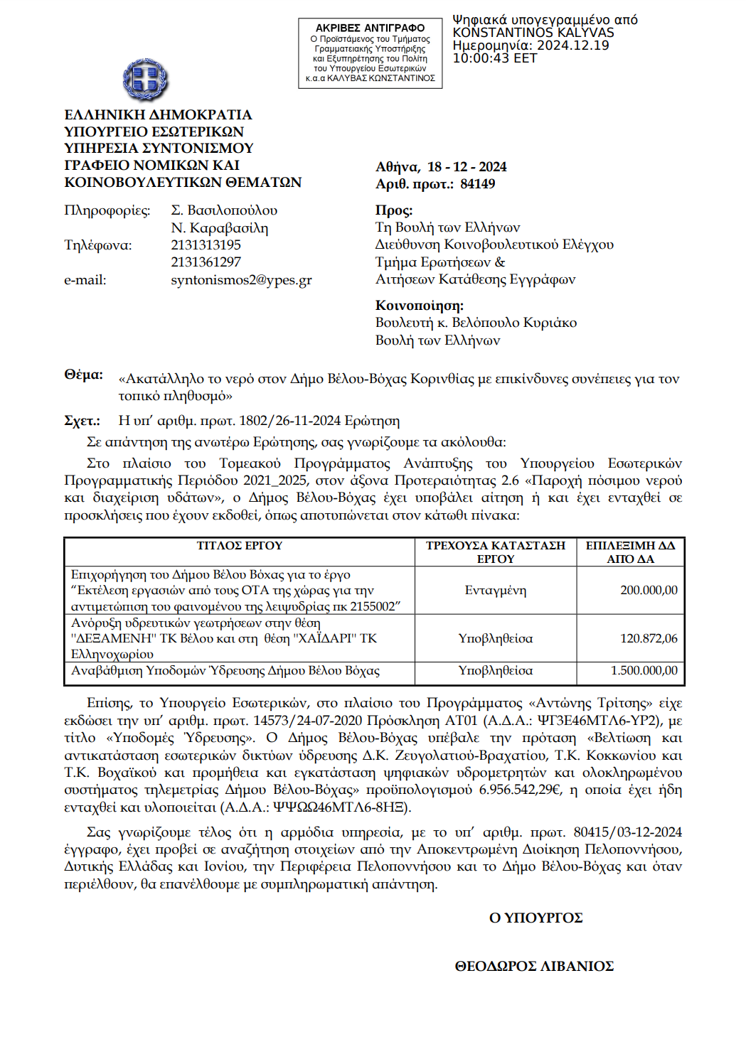 - Ενταγμένο έργο προϋπολογισμού 6.956.542,29€ για τη βελτίωση και αντικατάσταση των δικτύων ύδρευσης, την εγκατάσταση ψηφιακών υδρομετρητών και την εφαρμογή τηλεμετρίας στον Δήμο Βέλου – Βόχας.