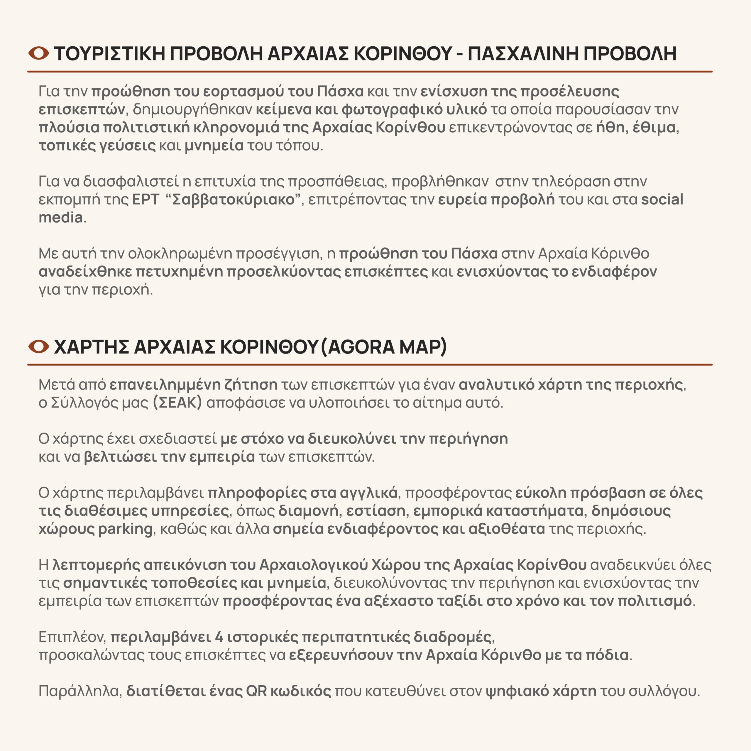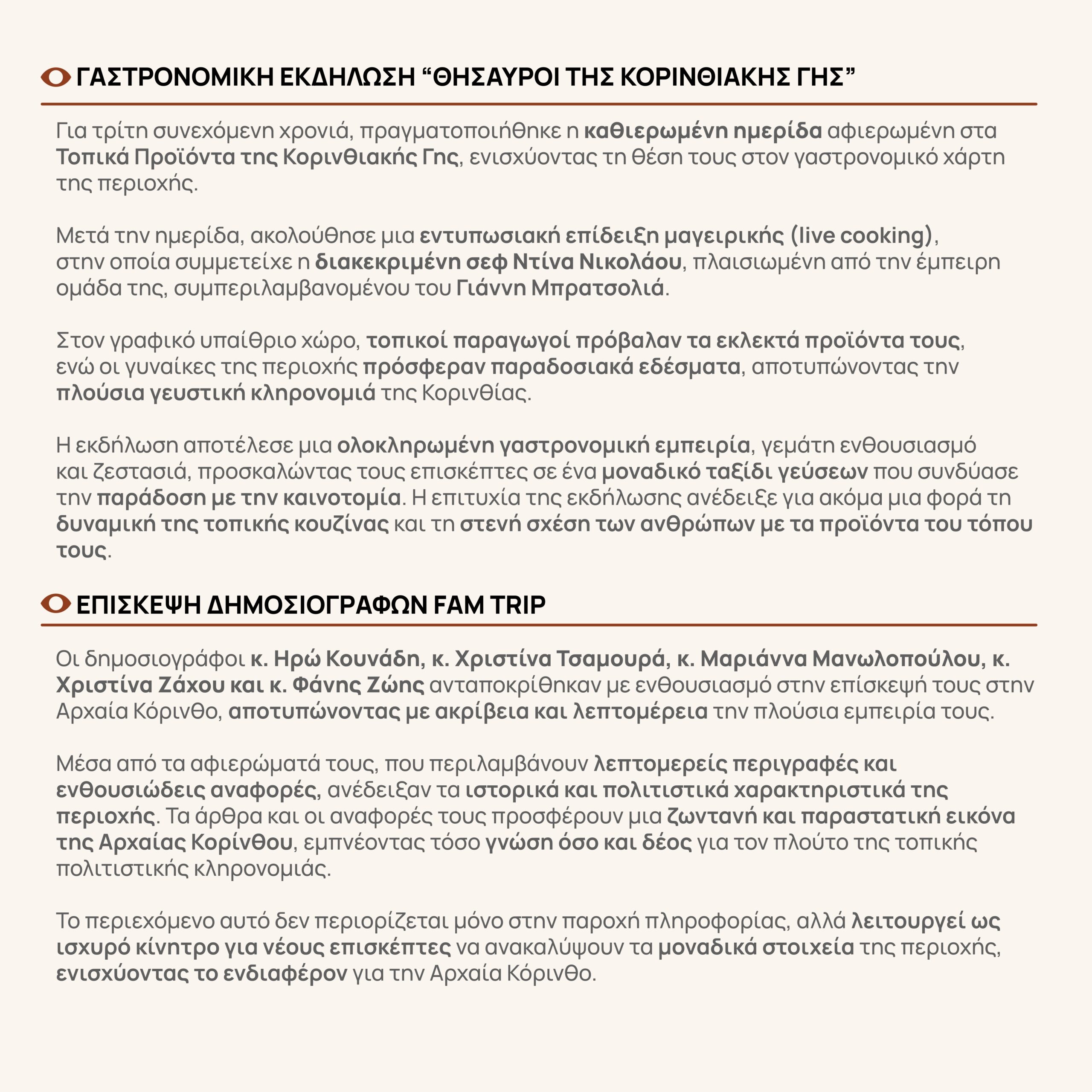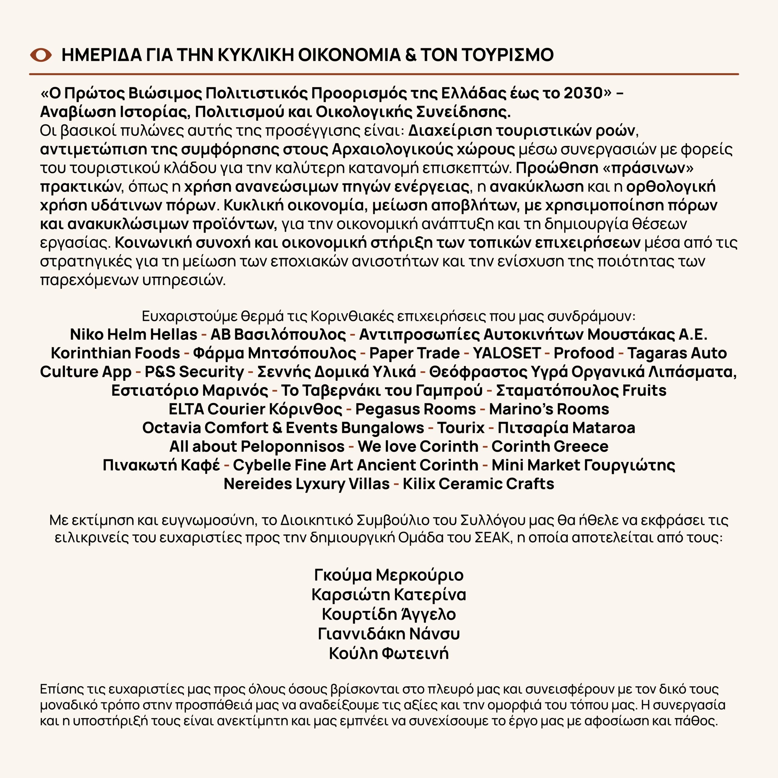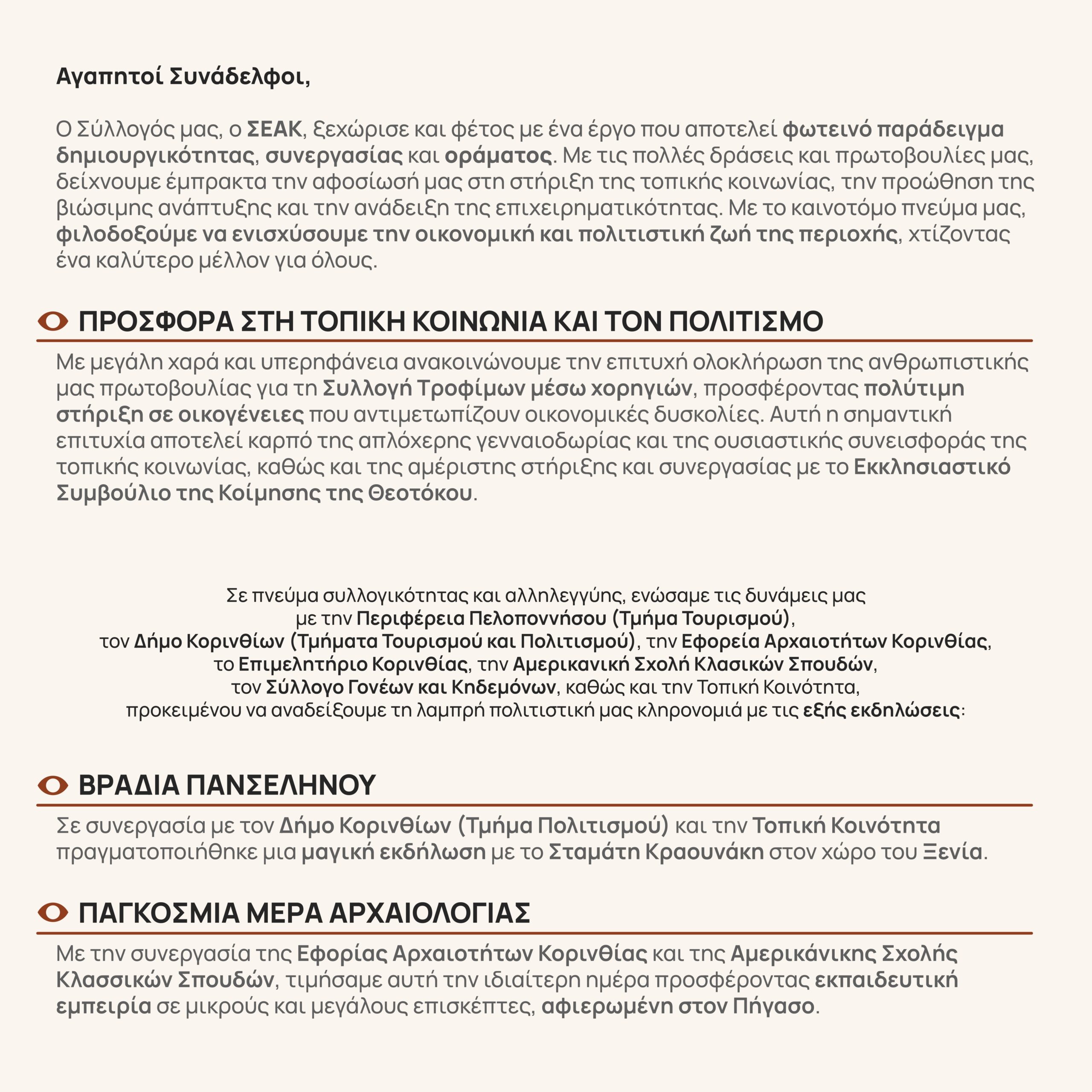 Ο Σύλλογος Επαγγελματιών Αρχαίας Κορίνθου, ξεχώρισε και φέτος με ένα έργο που αποτελεί φωτεινό παράδειγμα δημιουργικότητας, συνεργασίας και οράματος. Με τις πολλές δράσεις και πρωτοβουλίες του, αποδεικνύει έμπρακτα την αφοσίωσή του στη στήριξη της τοπικής κοινωνίας, την προώθηση της βιώσιμης ανάπτυξης και την ανάδειξη της επιχειρηματικότητας, όπως το ΔΣ του Συλλόγου αναφέρει στην εισαγωγή του απολογισμού του, εκφράζοντας, παράλληλα, την φιλοδοξία του να συνεχίσει με καινοτόμο πνεύμα το έργο του για την ενίσχυση της οικονομικής και πολιτιστικής ζωής της περιοχής, χτίζοντας ένα καλύτερο μέλλον για όλους.