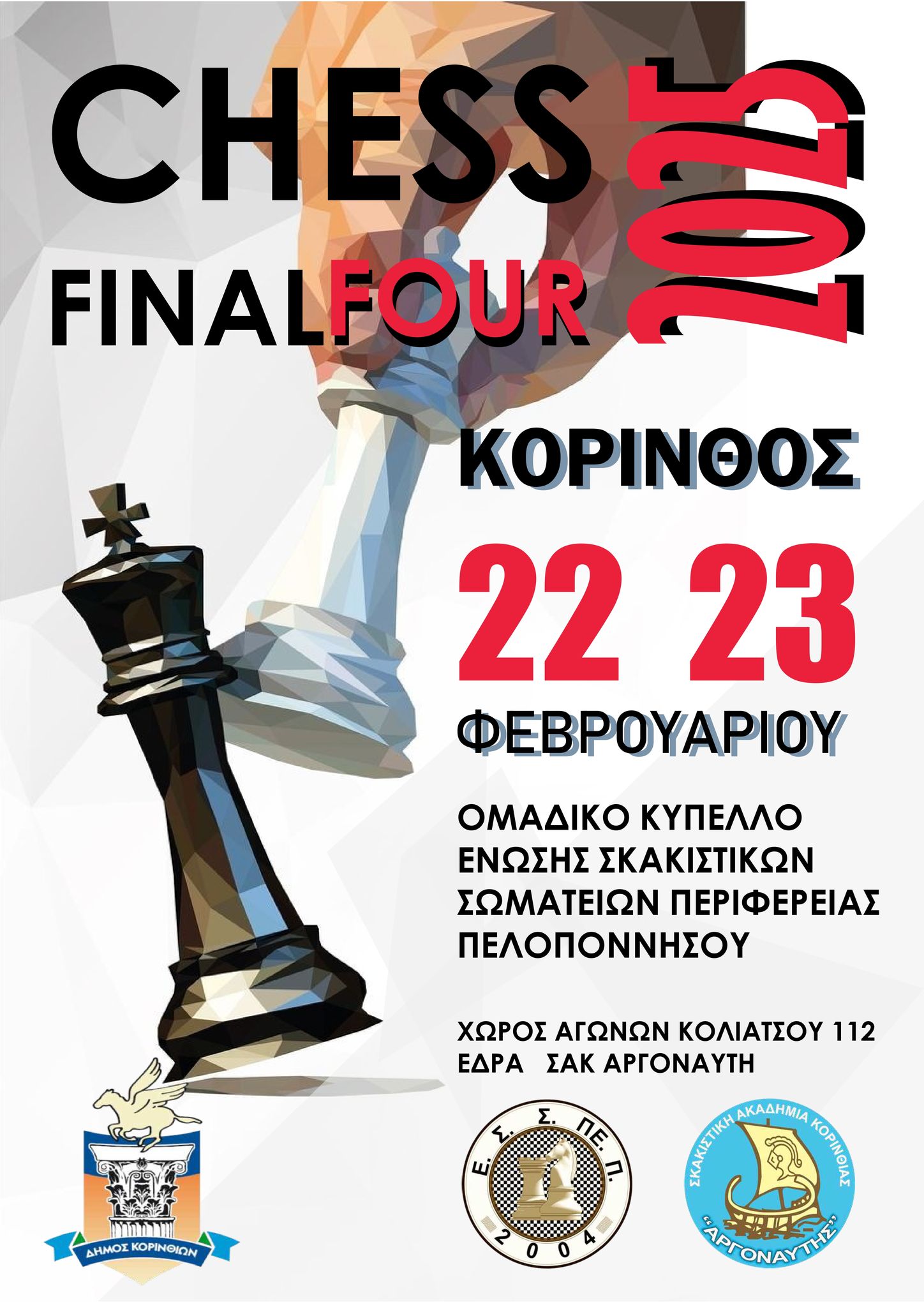 Η Ένωση Σκακιστικών Σωματείων Περιφέρειας Πελοποννήσου και η Σκακιστική Ακαδημία Κορινθίας Αργοναύτης, υπό την αιγίδα και την οικονομική ενίσχυση του Δήμου Κορινθίων, διοργανώνουν το Final Four του ομαδικού Κυπέλλου Περιφέρειας Πελοποννήσου για το 2025.